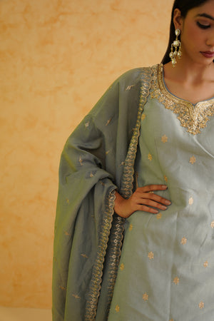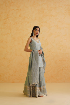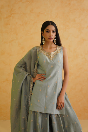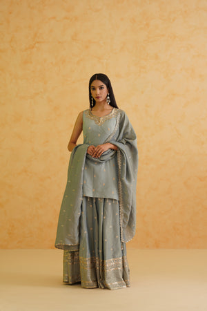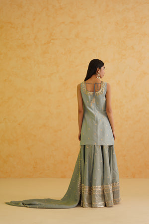Deepika Chadha's stunning grey georgette tissue fabric Garara, beautifully adorned with intricate gold crystal, sequins and bead embroidered floral kurti. The grey color adds a touch of glamour and sophistication to your look, while its texture ensures you feel comfortable all day or night long. It is styled with a grey georgette tissue Dupatta to complete the look.