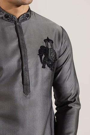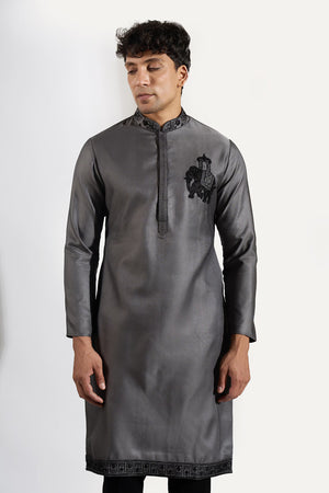 Grey ombre cotton silk based kurta enhanced with black cutdana motif embroidery, paired with black dupion silk based pants
