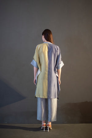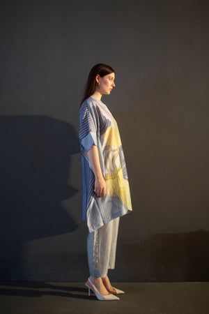 A two piece dupion silk set comprised of abstract geometric and floral print in playful color compositions and parallel pants with fusion textiles.