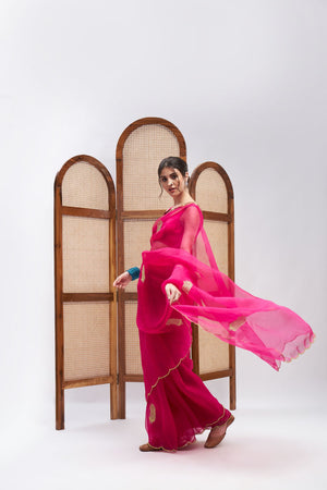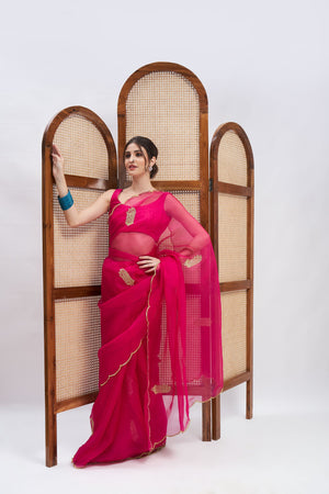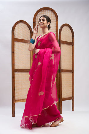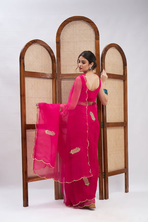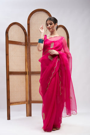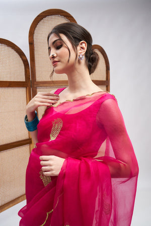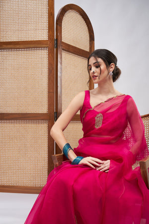 The pure silk organza fabric ensures comfort throughout the day or evening, allowing you to move with ease while looking effortlessly chic. Whether you're attending a wedding, a festive celebration, or a special event, this saree set is designed to make you exude grace and style.