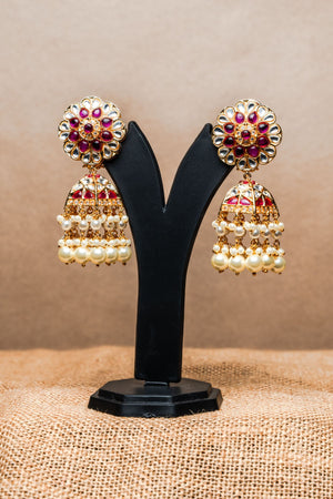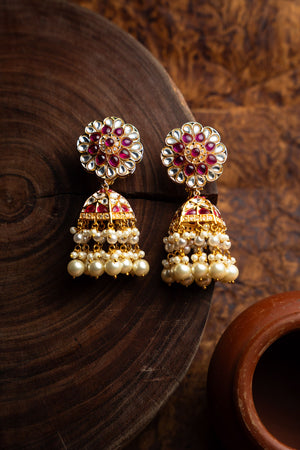 These glamorous jhumkas with a polki finish with a touch of semi precious stones and pearl drops, will always be a timeless and iconic piece.