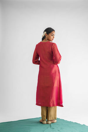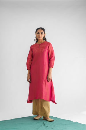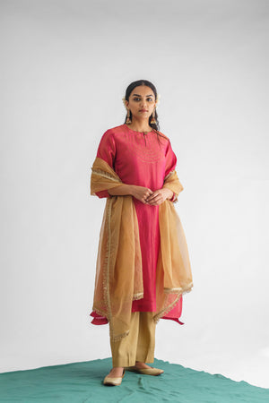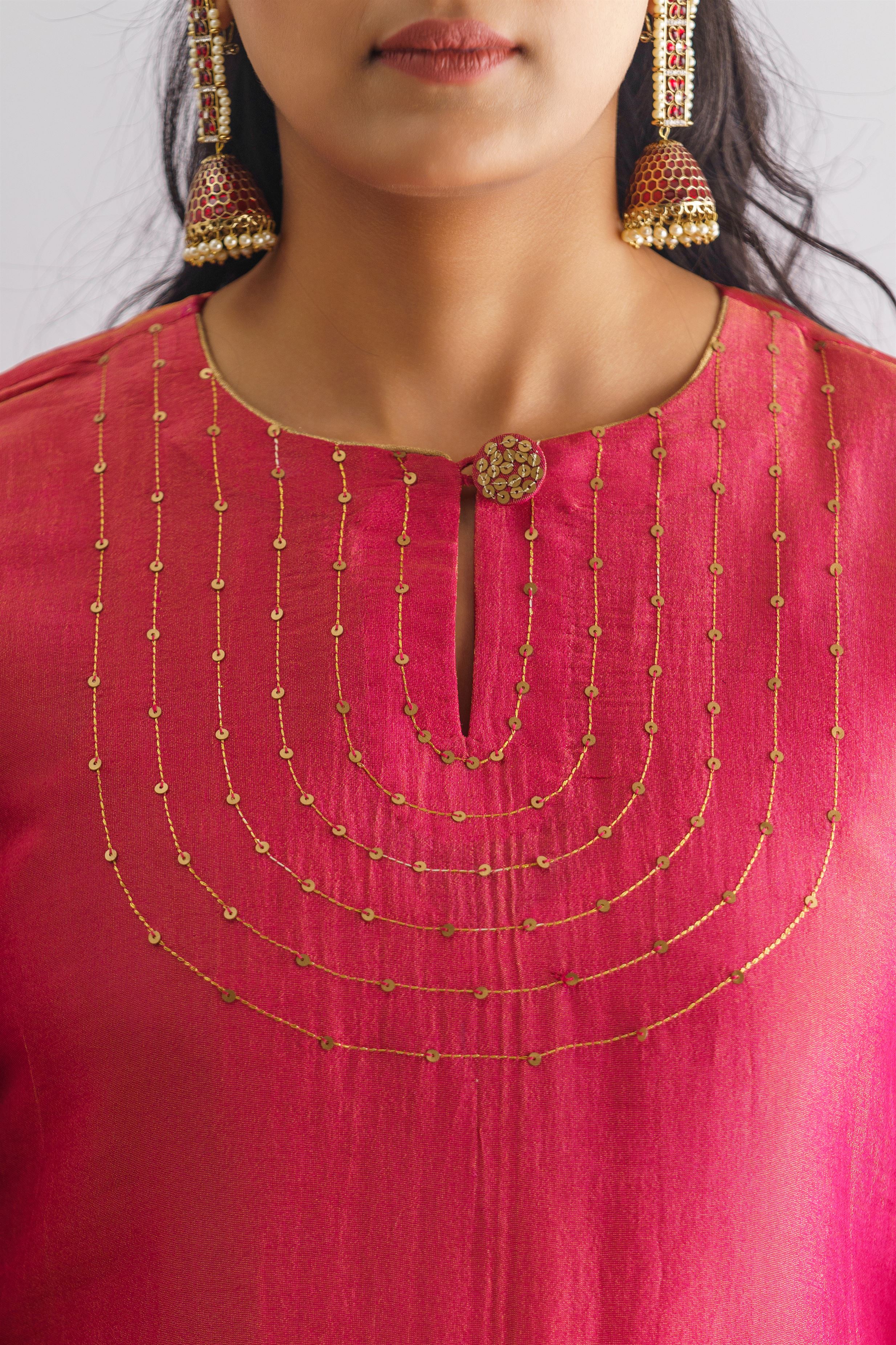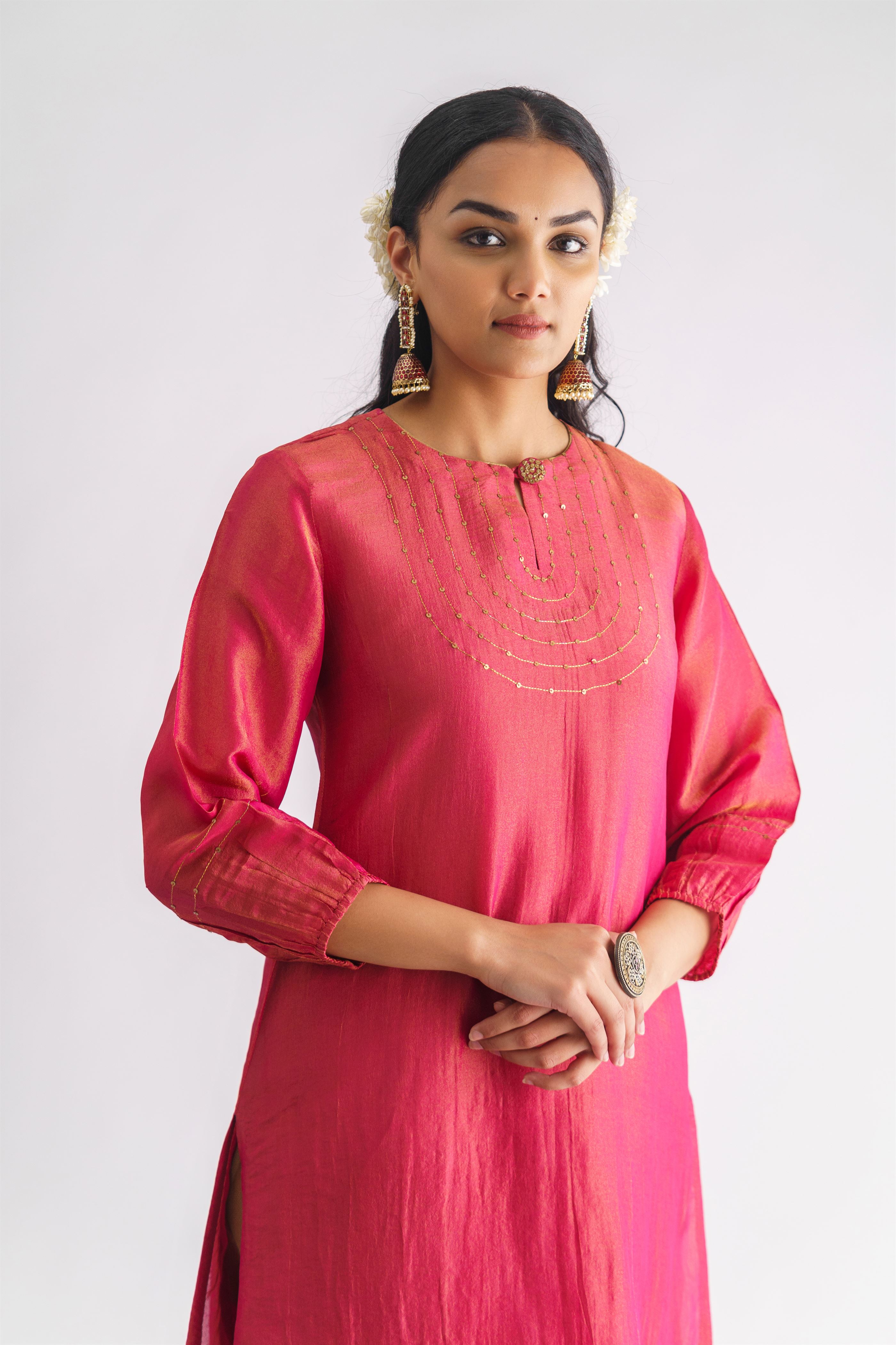 This kurta is crafted from exquisite georgette tissue fabric in a stunning pink hue. The front showcases immaculate stitchwork accentuated with opulent sequins. The round neck is designed with a keyhole and features an embellished button, elevating the kurta's allure. The three-quarter length sleeves with elasticated hems exhibit stitch and sequin detailing that is reminiscent of the kurta's front. Comes with a slip.