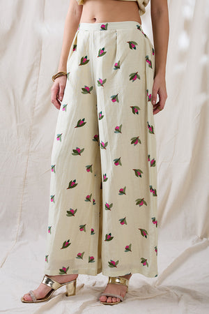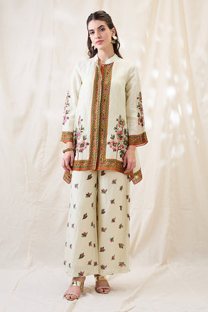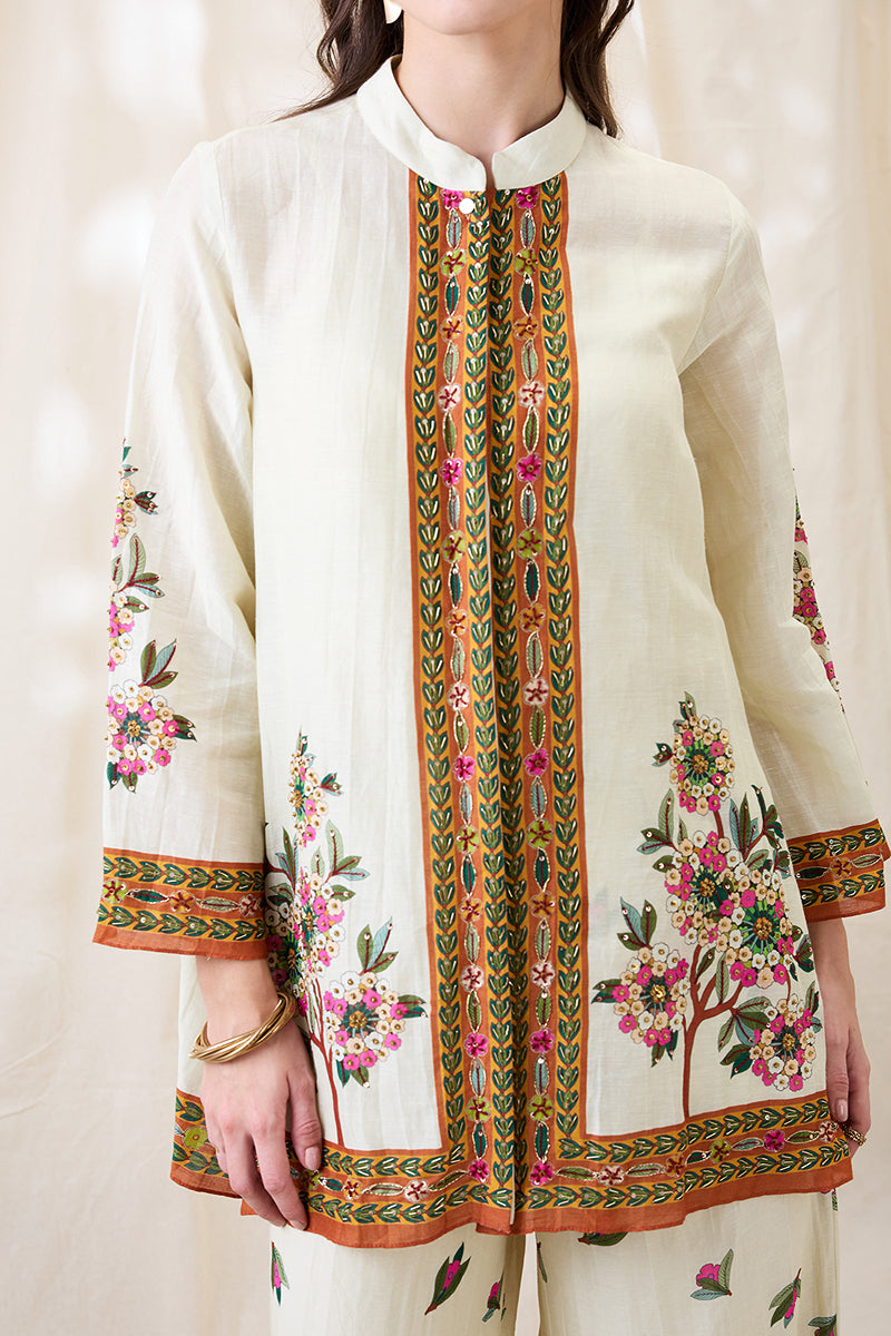 Beige Gulzaar embroidered A-line tunic, paired with straight pants in linen.
