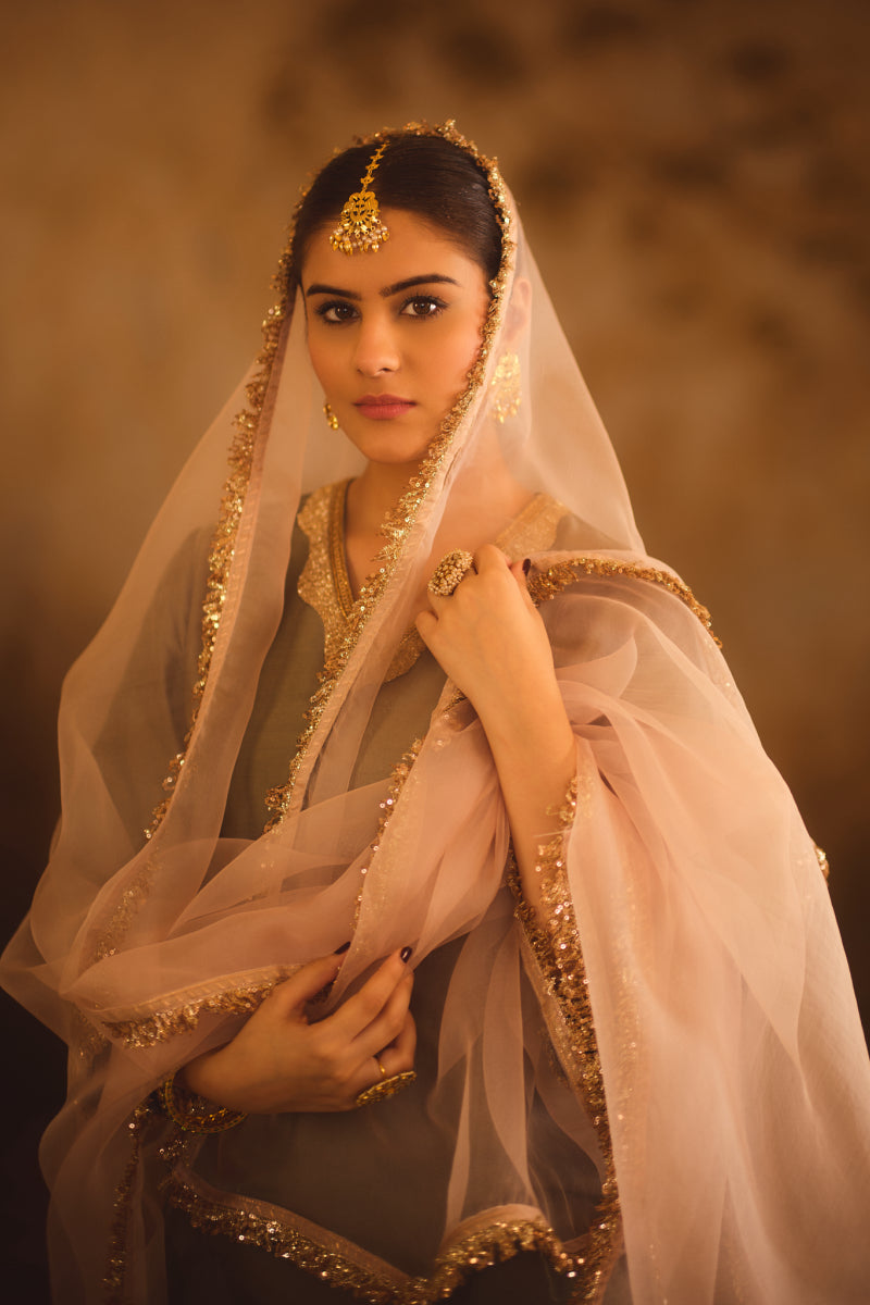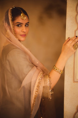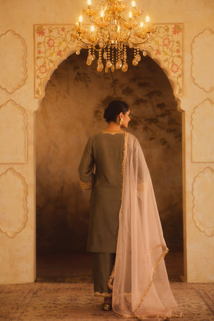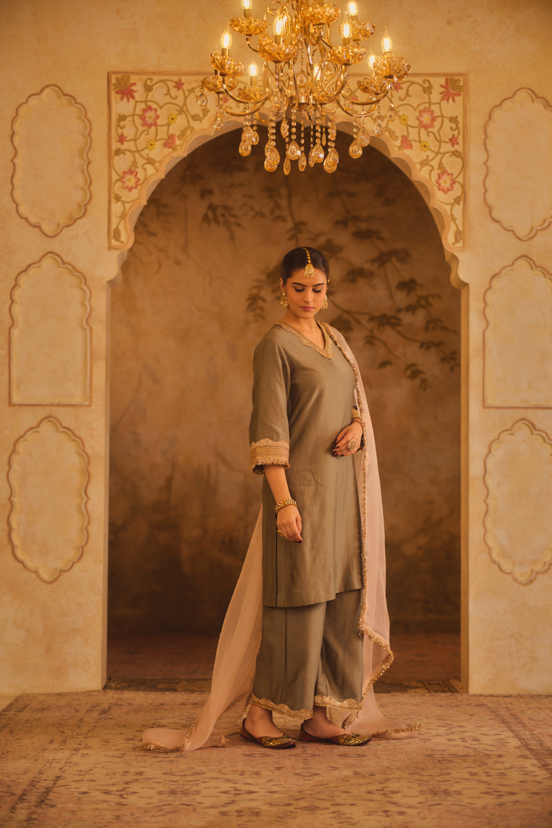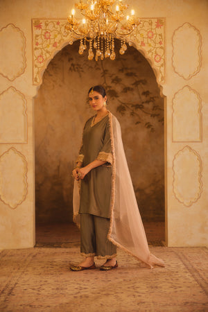 Green A-Line Kurta featuring V-neck Kurta and long sleeves with Beautiful Gota Combination borders. Paired with Wide Leg Pants and a fringe lace dupatta.