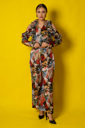 Visualize an organza top with exagerated ruffles and comfy pants , which will make you look stylish and edgy .