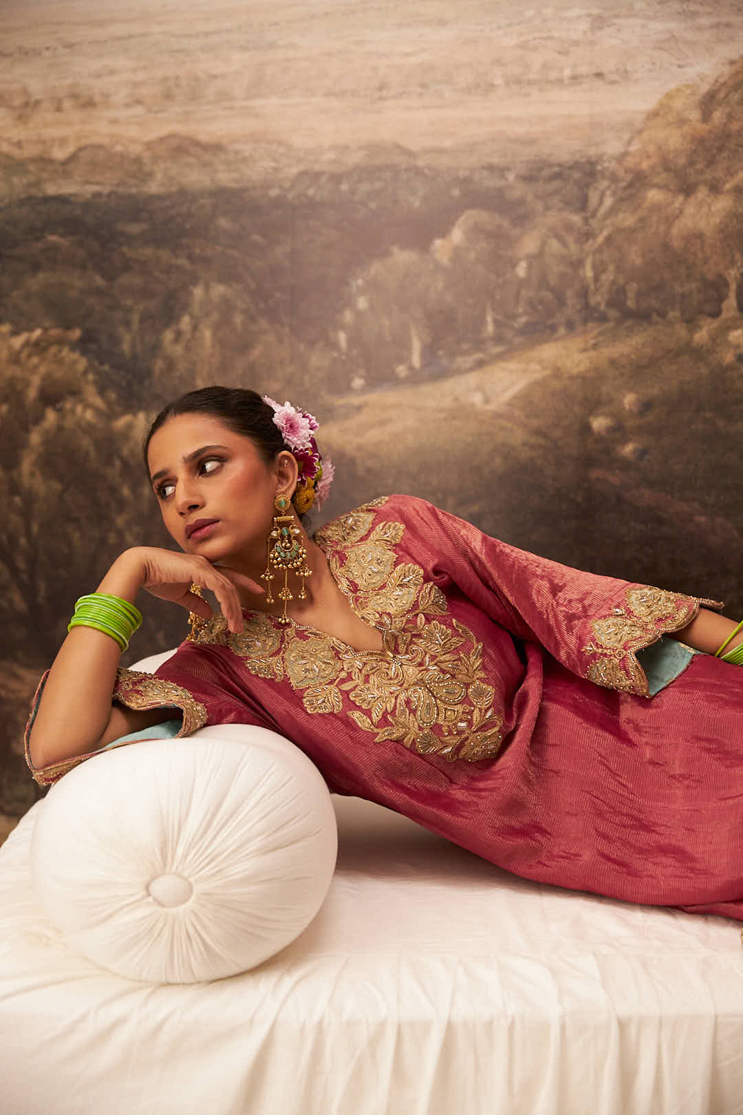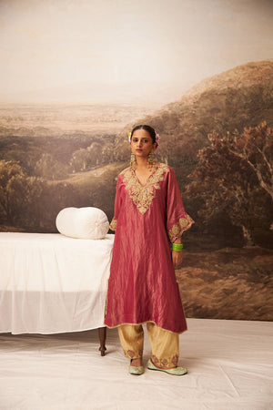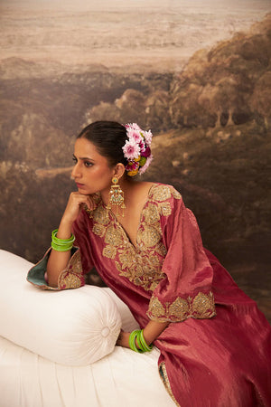 Wine chanderi zari kaftan has "V" neck with hand zardosi and machine embroidery. Sleeves are loose fit with hand zardosi and machine embroidery. Kaftan comes with attached lining. Bottom is salwar in silk chanderi with hand and machine embroidery.