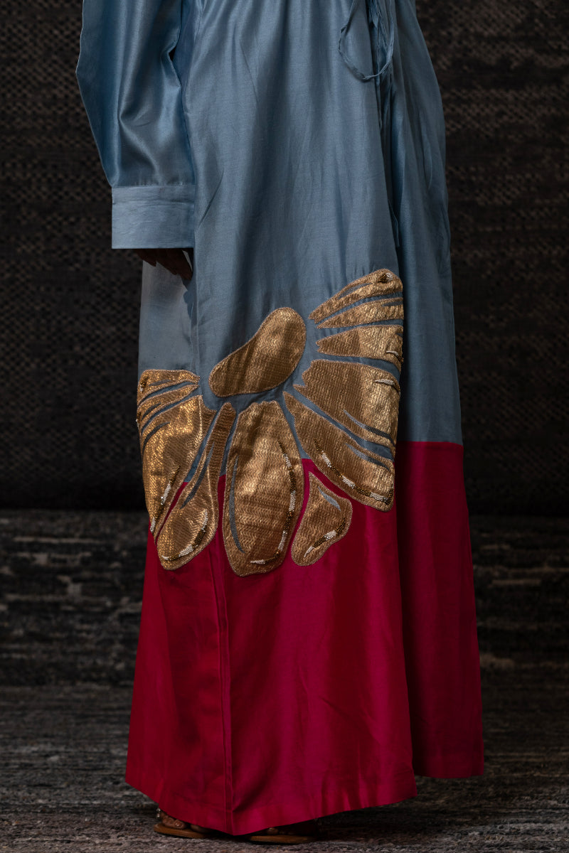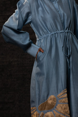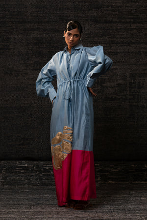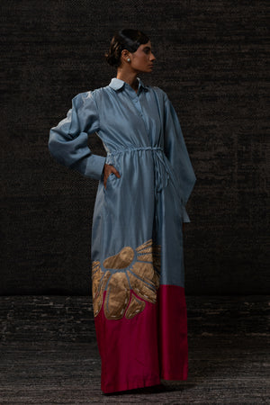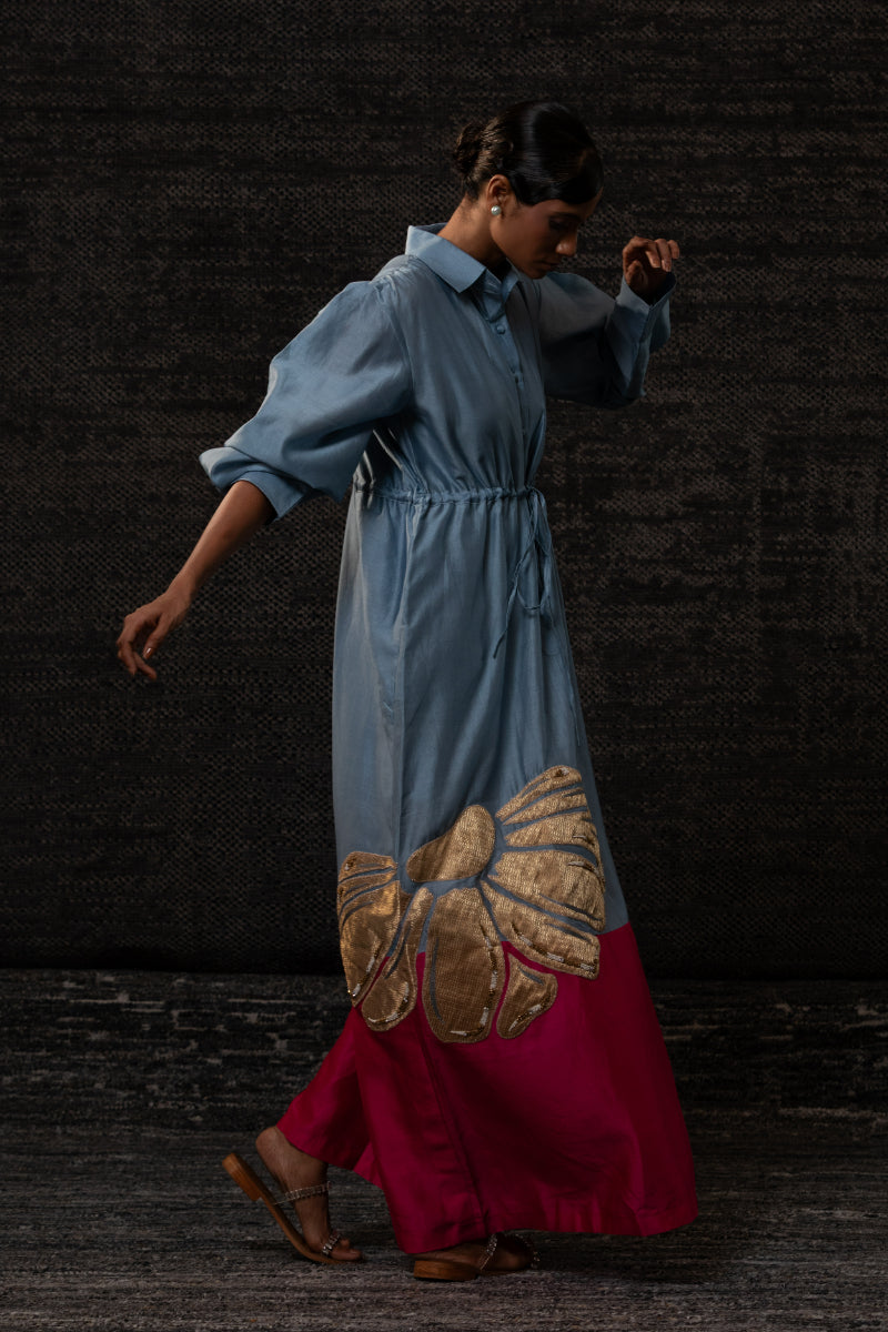 A graceful silk-chanderi shirt-dress with soft volume sleeves, a drawstring waist, and a contrast hem panel.