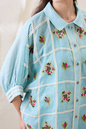 Blue Gulzaar appliqued shirt with lace embellishment, paired with straight pants in linen.