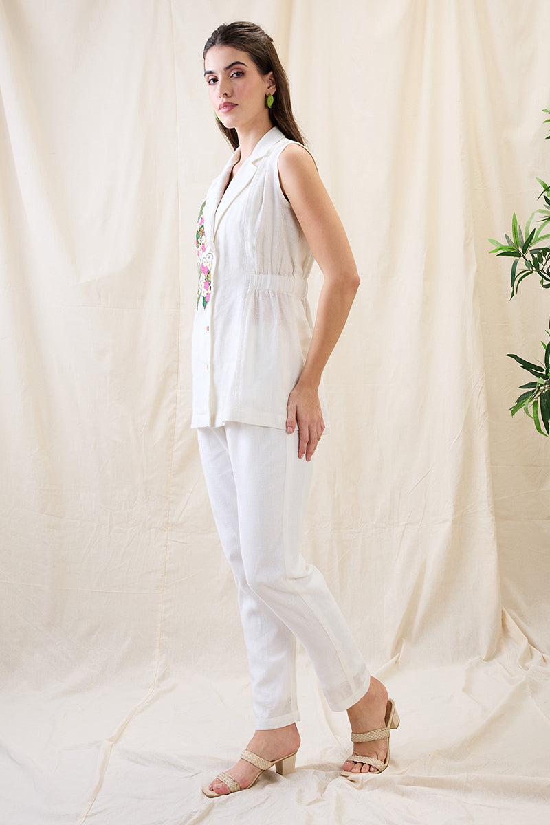 White Nooma Appliqued panelled top, paired with straight pants in linen.
