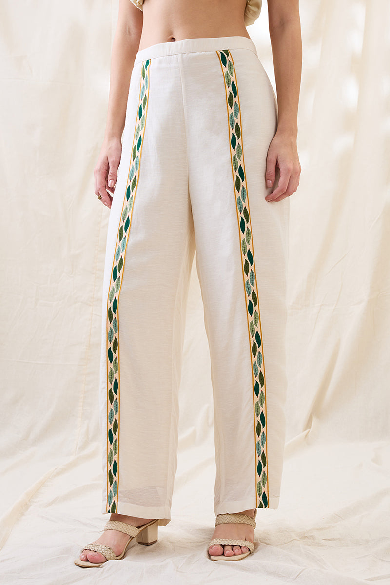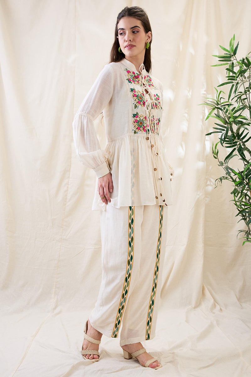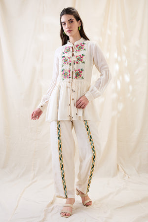 White Gulzaar appliqued peplum top with front tie-ups, paired with straight pants in linen.