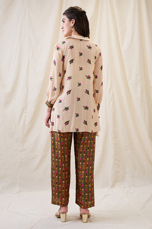 Beige Gulzaar embroidered kurta and pants, paired with embroidered jacket in silk.