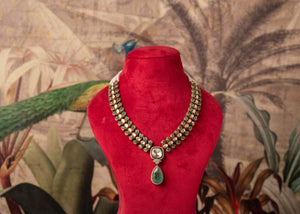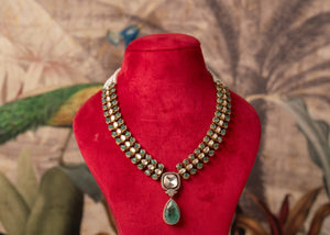 The Haadis necklace for men is a refined and elegant accessory crafted from 92.5 sterling silver, ensuring both quality and durability. The necklace is plated with 18k gold, giving it a luxurious finish and a warm, radiant glow that complements any outfit. Its sleek and minimalist design exudes sophistication, making it a versatile piece suitable for both formal and casual wear. Classic design elements with pearls lining the saraafa, moissanite polkis and green semi -precious stones, our karigars have crafted affordable luxury with great love and thought.