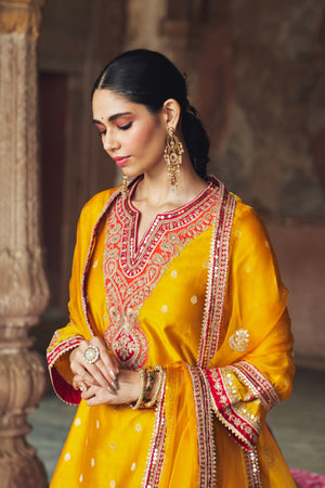 This elegant ensemble is crafted in pure Silk Chanderi Banarasi and paired with a traditional Dogri salwar. The kurta features a zero neckline with a front slit and three-quarter bell sleeves. Adorned with intricate Kashmiri Tilla and Gota Patti embroidery, highlighted with pearls and sequins, the outfit is beautifully finished with delicate gota detailing.