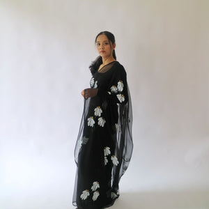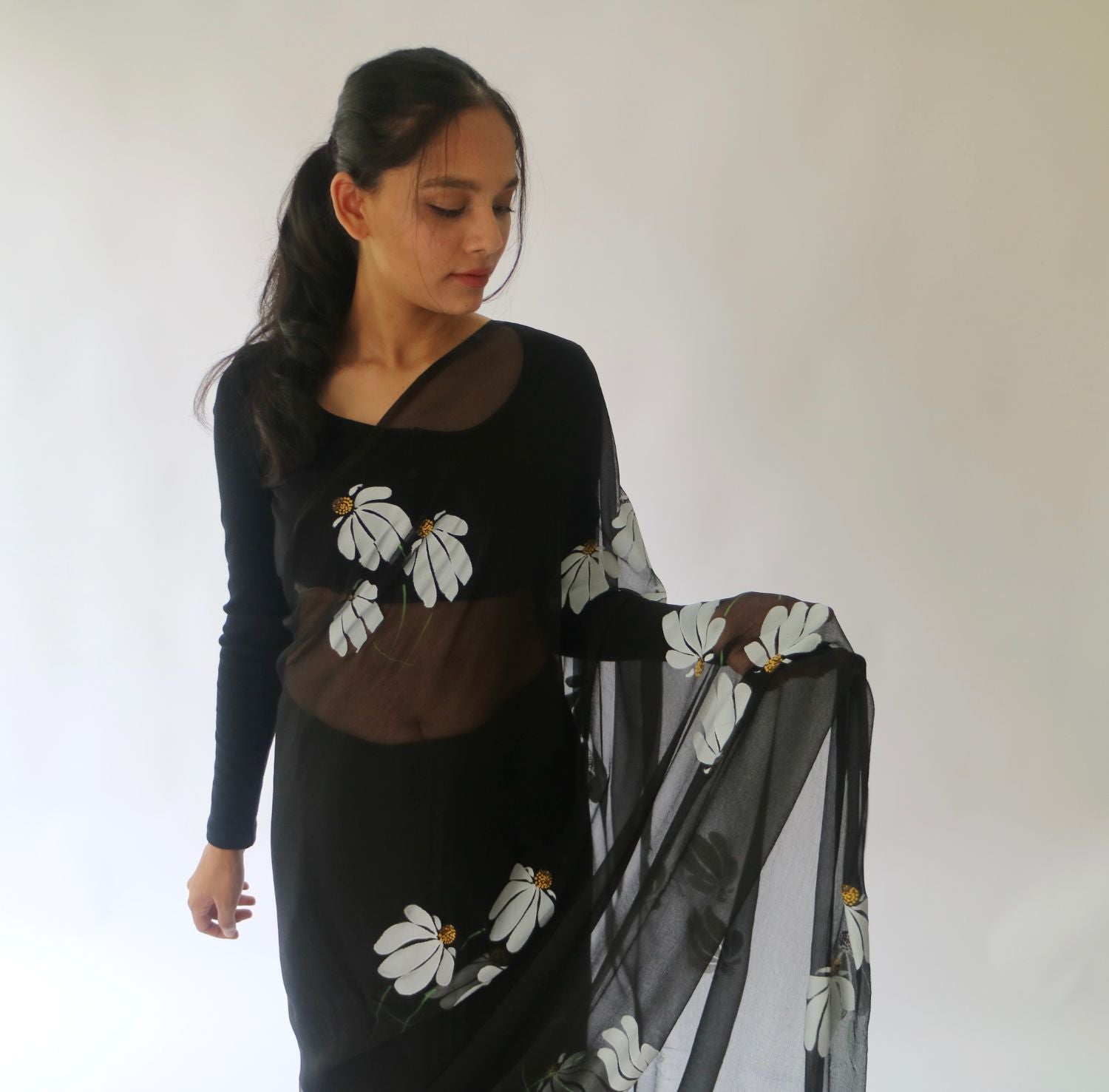 Black Base Chiffon Saree Hand-Painted With White Half-Daisies