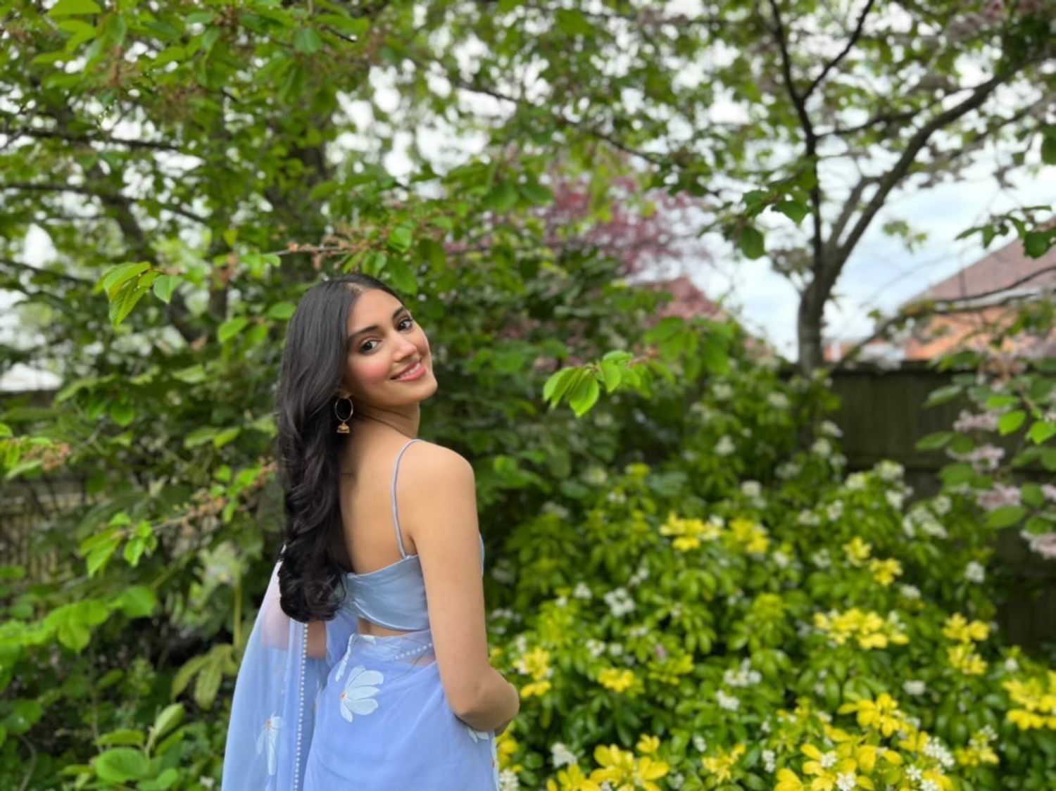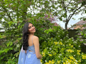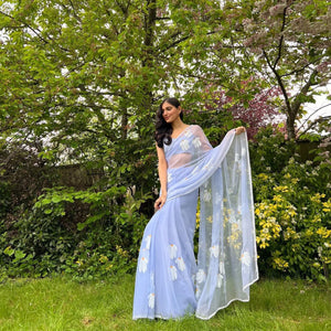 Ash-Blue Base Chiffon Saree Hand-Painted With White Half-Daisies Enhanced With A Pearl Border
