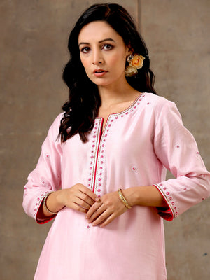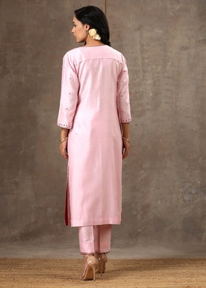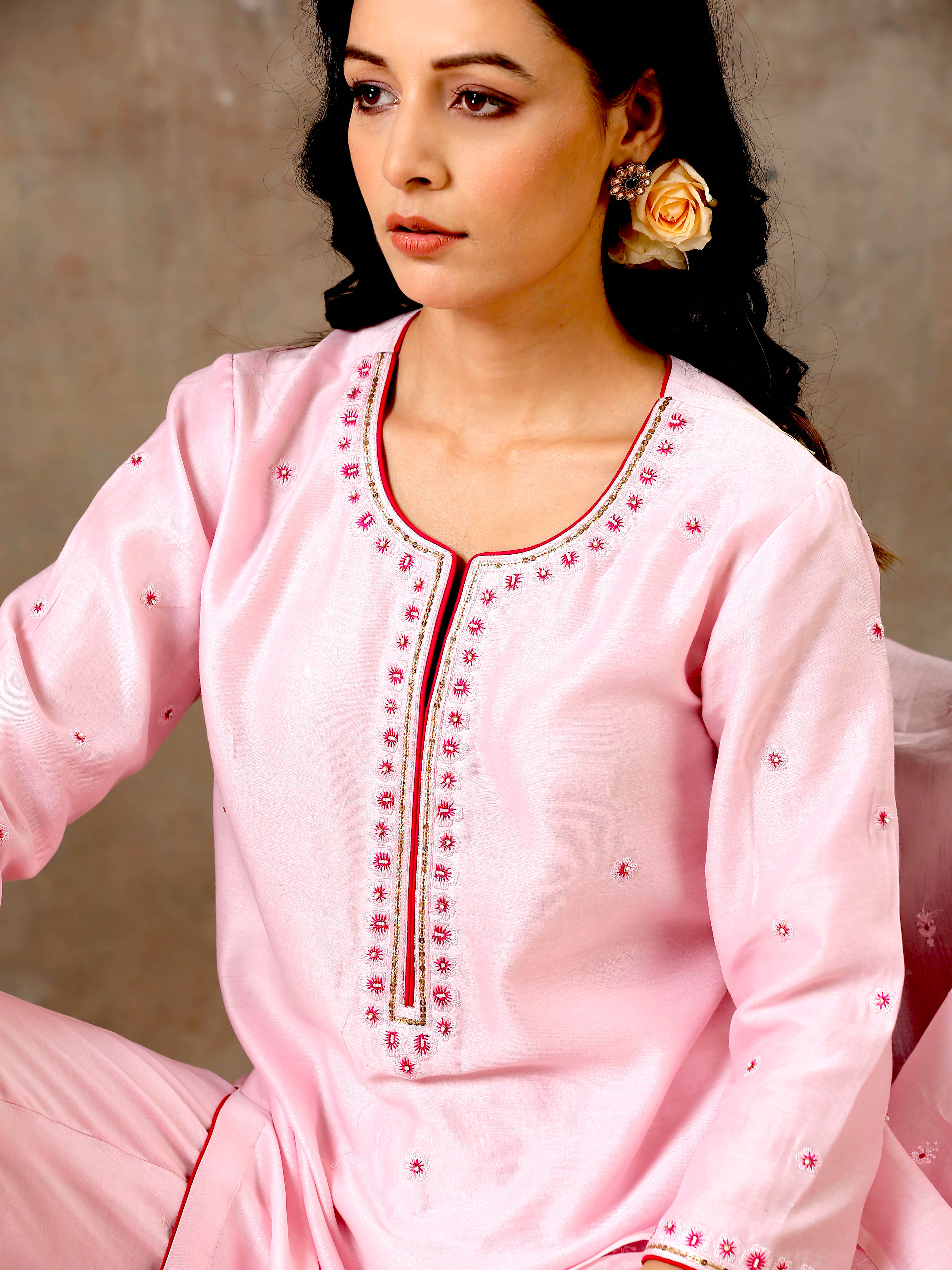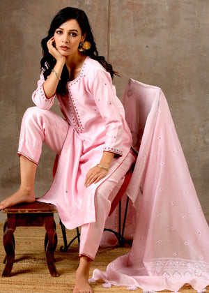 Hand Embroidered Chanderi Silk Pink Kurta Set