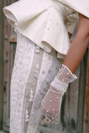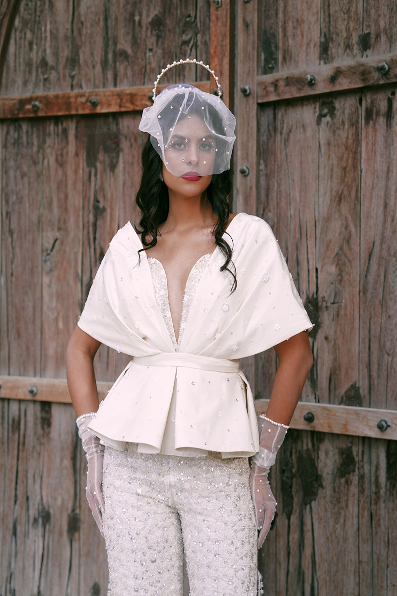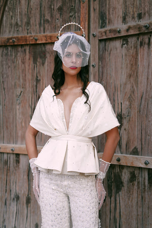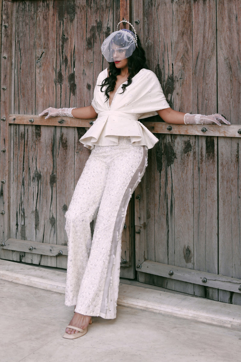 peplum constructed draped top and panelled trouser with handwork beaded peal embroidery in 3Dlook, tassel details.
