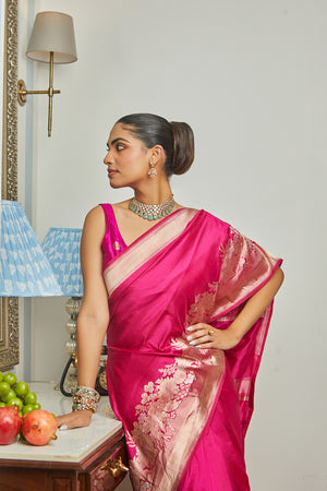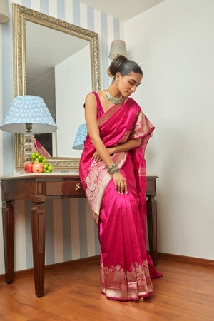 Handwoven Fuschia Pink Plain Body Katan Silk With Floral Border & Pallu Saree