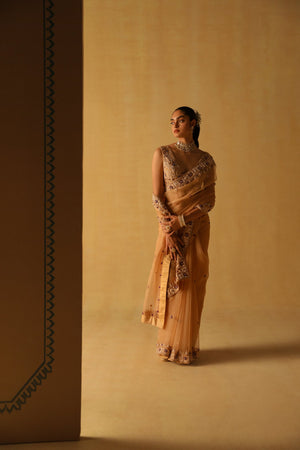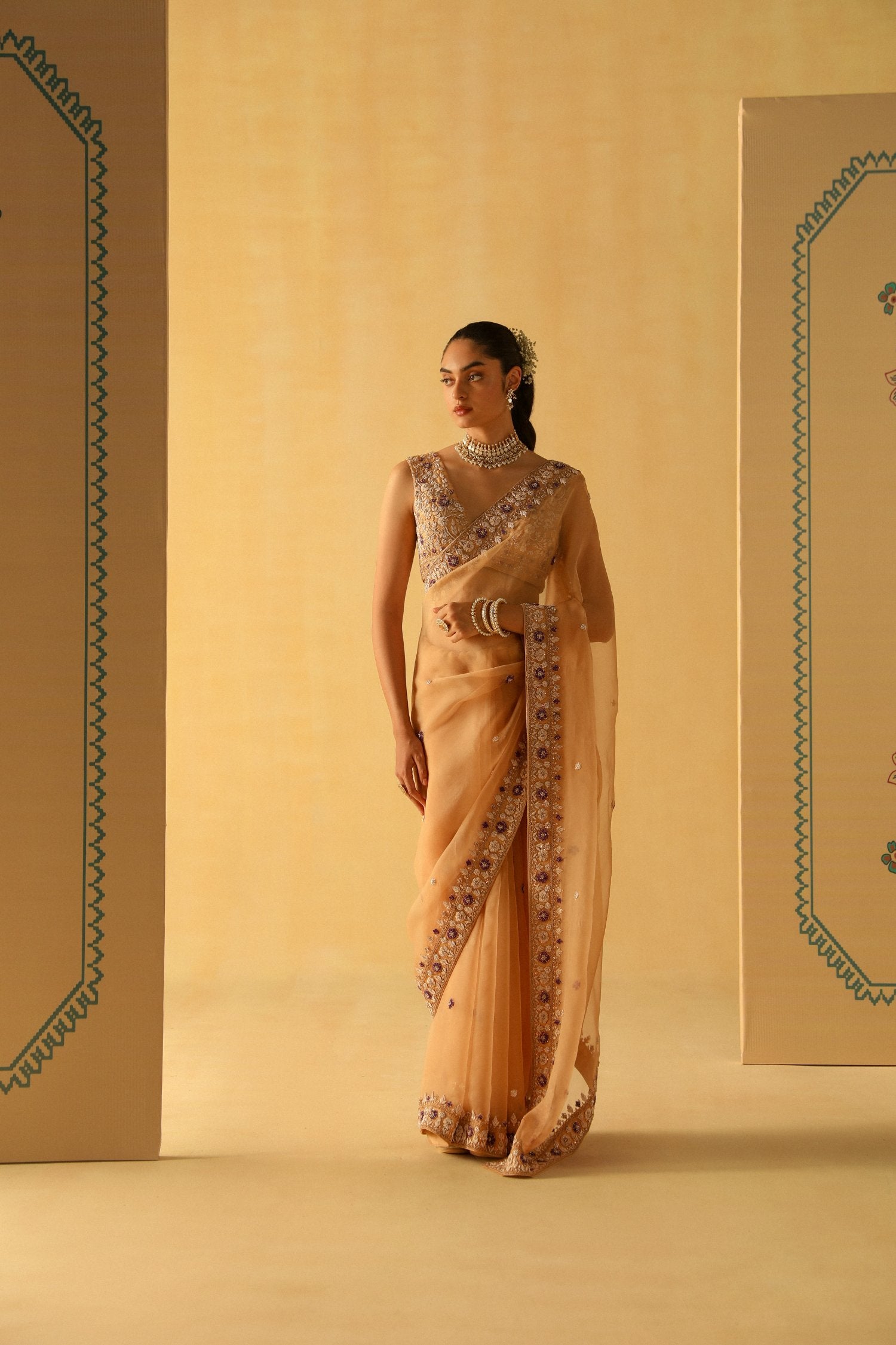 Our Hannah Saree is crafted from luxurious Silk Organza threads, adorned with detailed Dabka Zardozi embroidery. It comes with a matching Raw Silk blouse, also intricately embroidered.