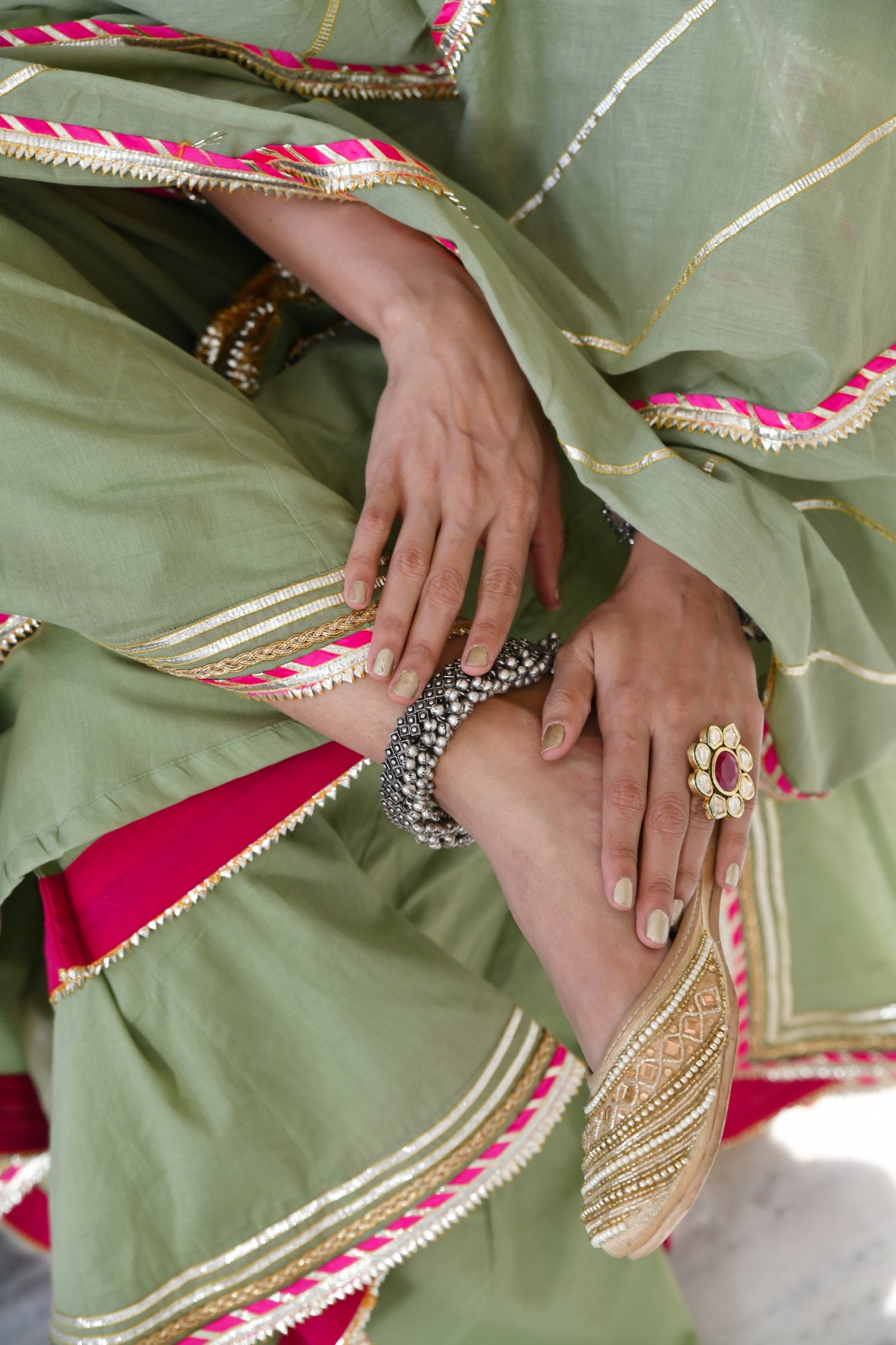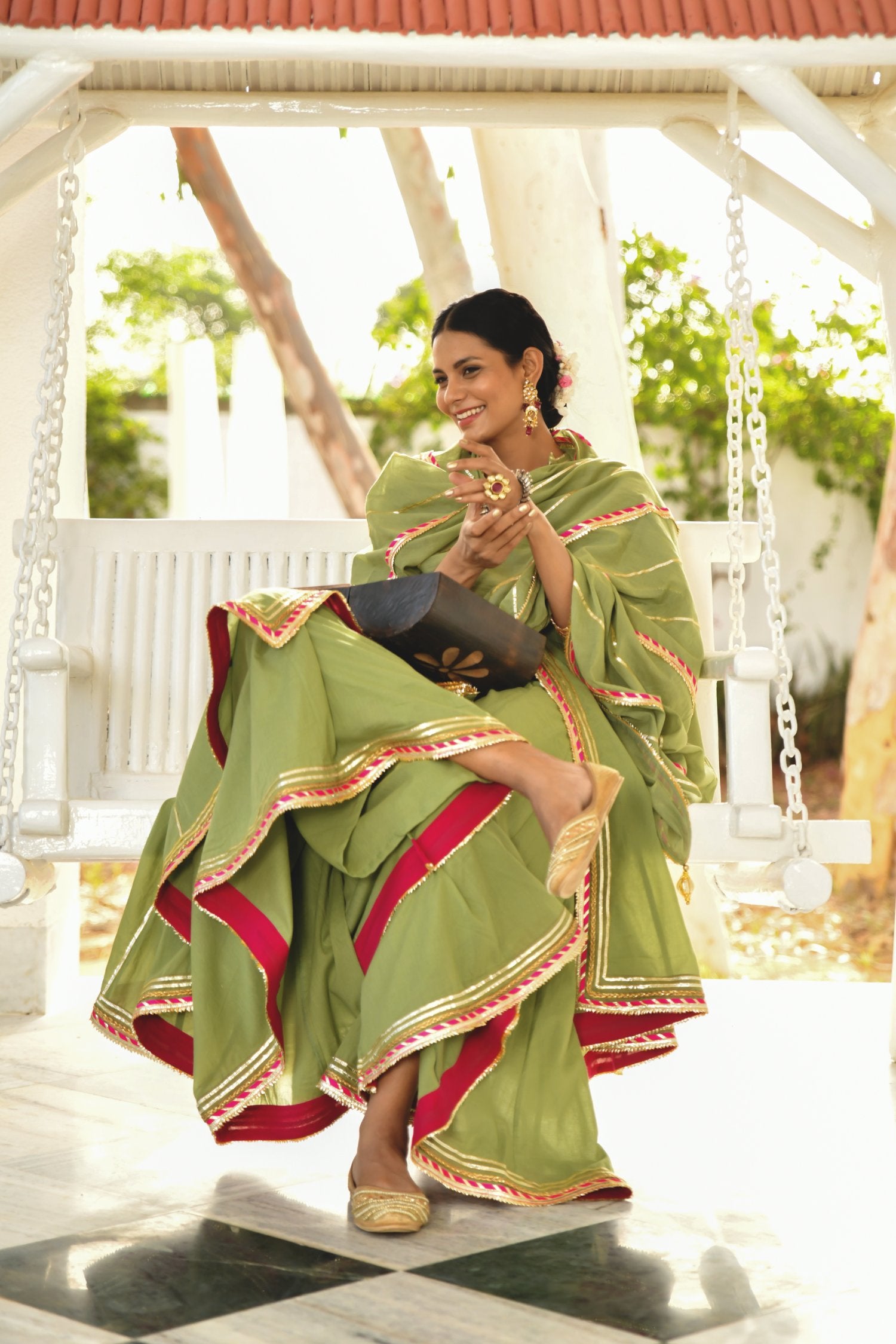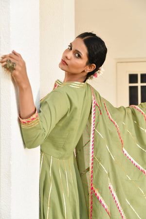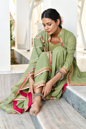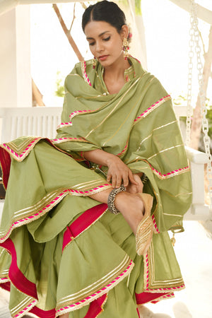 Master the art of looking perfect for Mehndi ceremony with this moss green kurta and sharara set with dupatta. The set has been tailored with care from cotton mulmul fabric and assures a soothing touch against the skin. The full sleeves, band neck, hi-low cut kurta, heavy Gota and contrast magzi detailing of kurta adds to its design. The kalidar sharara and 2.5 meters dupatta are adorned with Gota lines and contrast magzi all over that speak for the intricate workmanship.