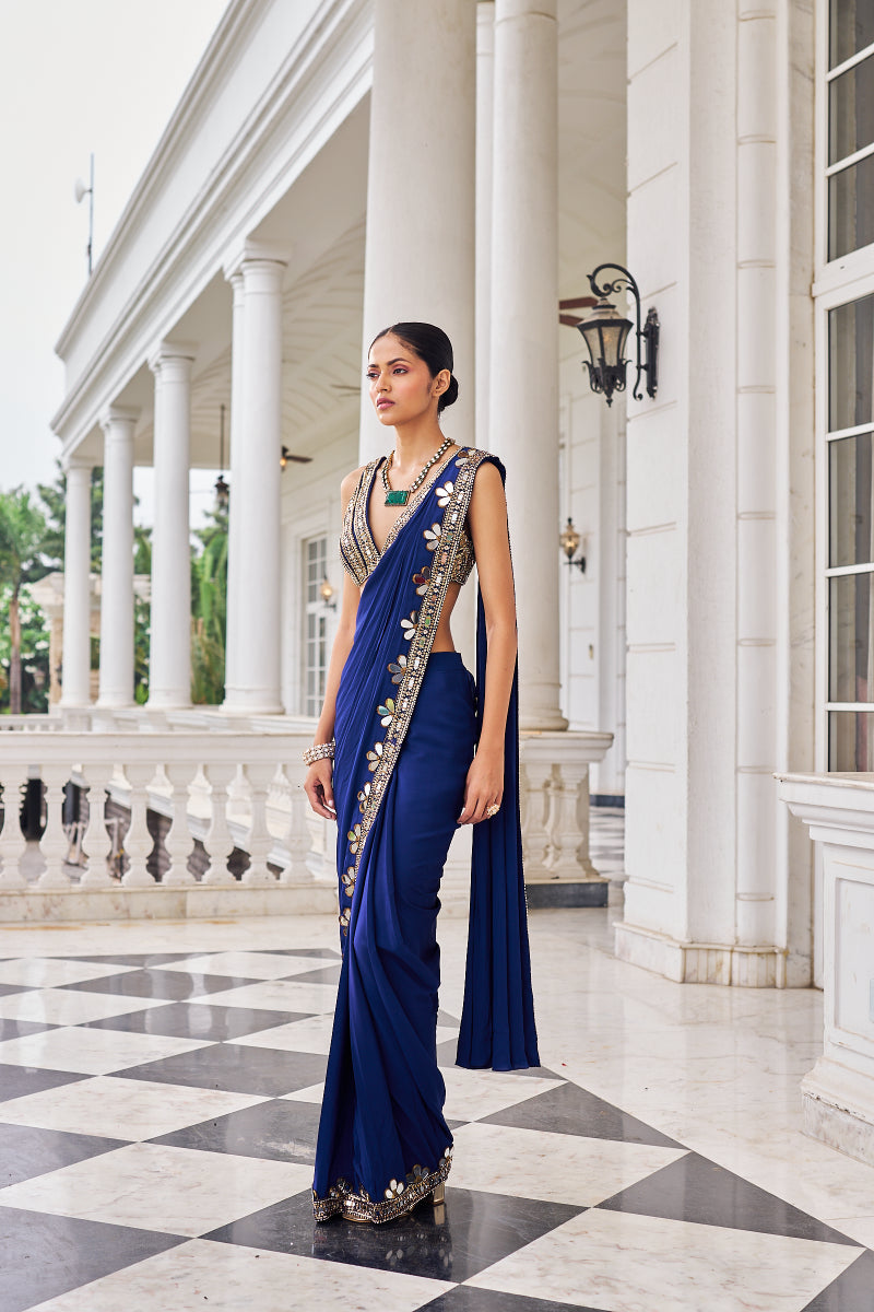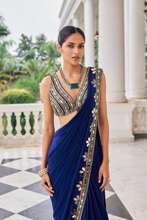 The gorgeous purple saree in crepe has beautiful border which is embroided the blouse is padded on which embroidery is there mirror work enhancing the look of the blouse.