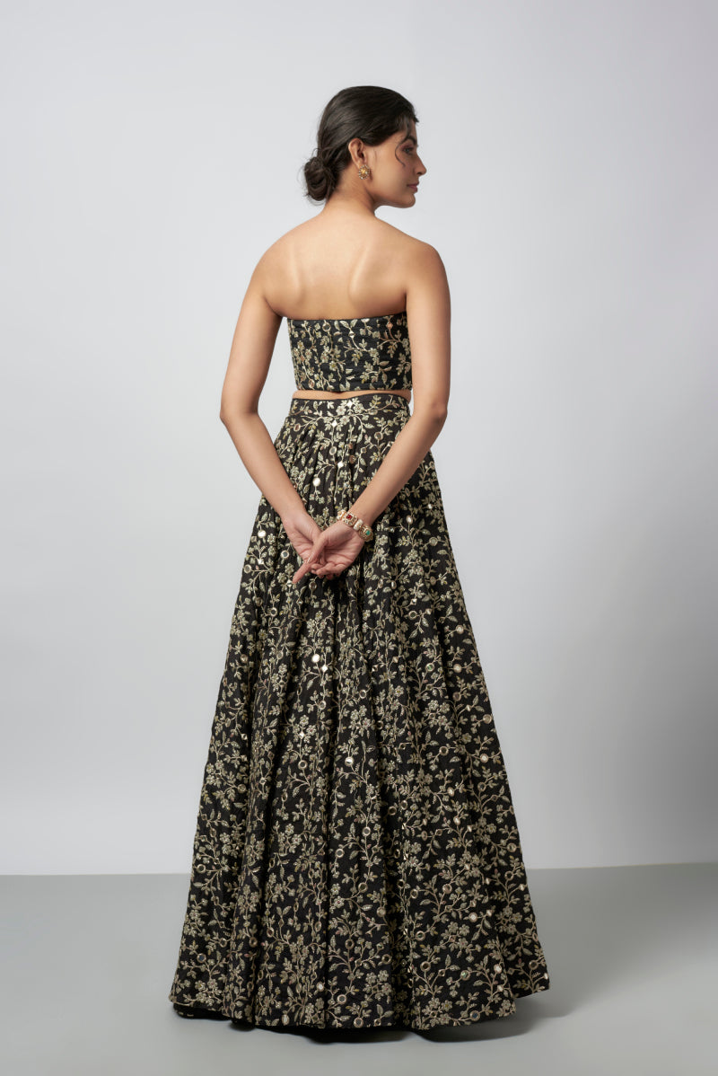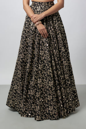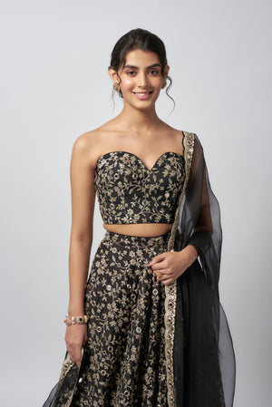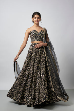 Featuring a sweetheart-neckline blouse with intricate floral embroidery in gold threads. Paired with a lehenga fully embellished with floral patterns and sequin detailing, adding a touch of sparkle. Organza dupatta bordered with ornate embroidery and mirror accents, gracefully completes the look.