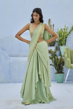 Tissue Silk pre-draped cascade saree with glass beads embellished edging paired with glass beads, pearl and sequence embroidered sweetheart neck blouse