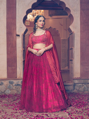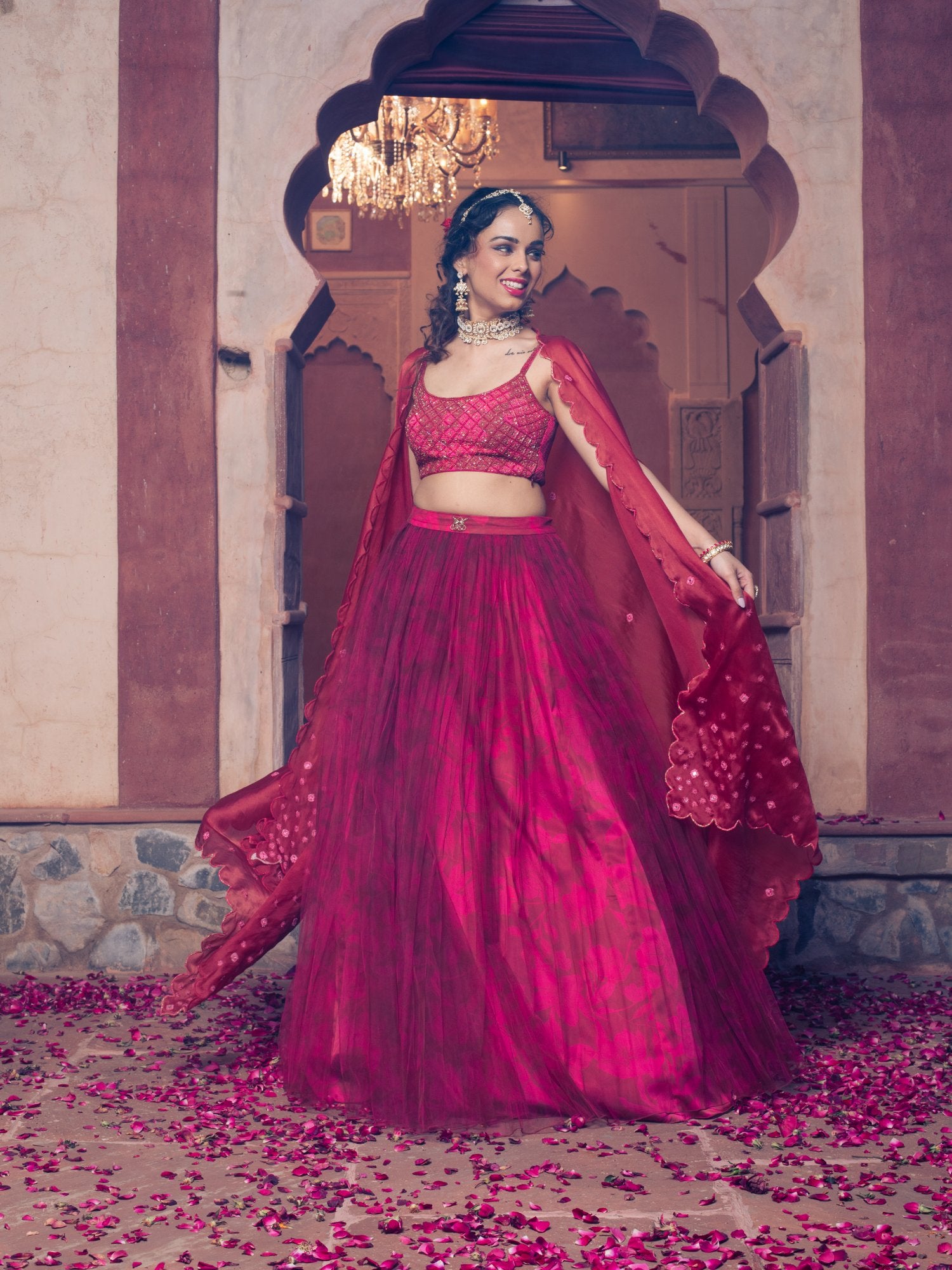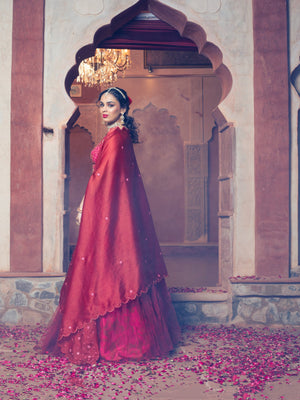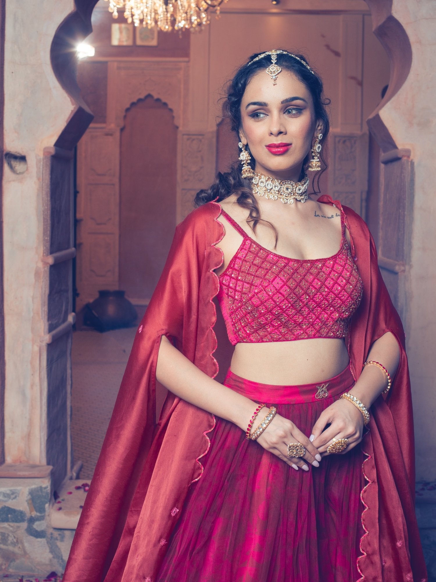Featuring a Sequin, Beads and Naka Tiki work hand embroidered and printed Blouse in Satin base and printed gathered Net Lehenga paired with embroidered Organza Satin Cape