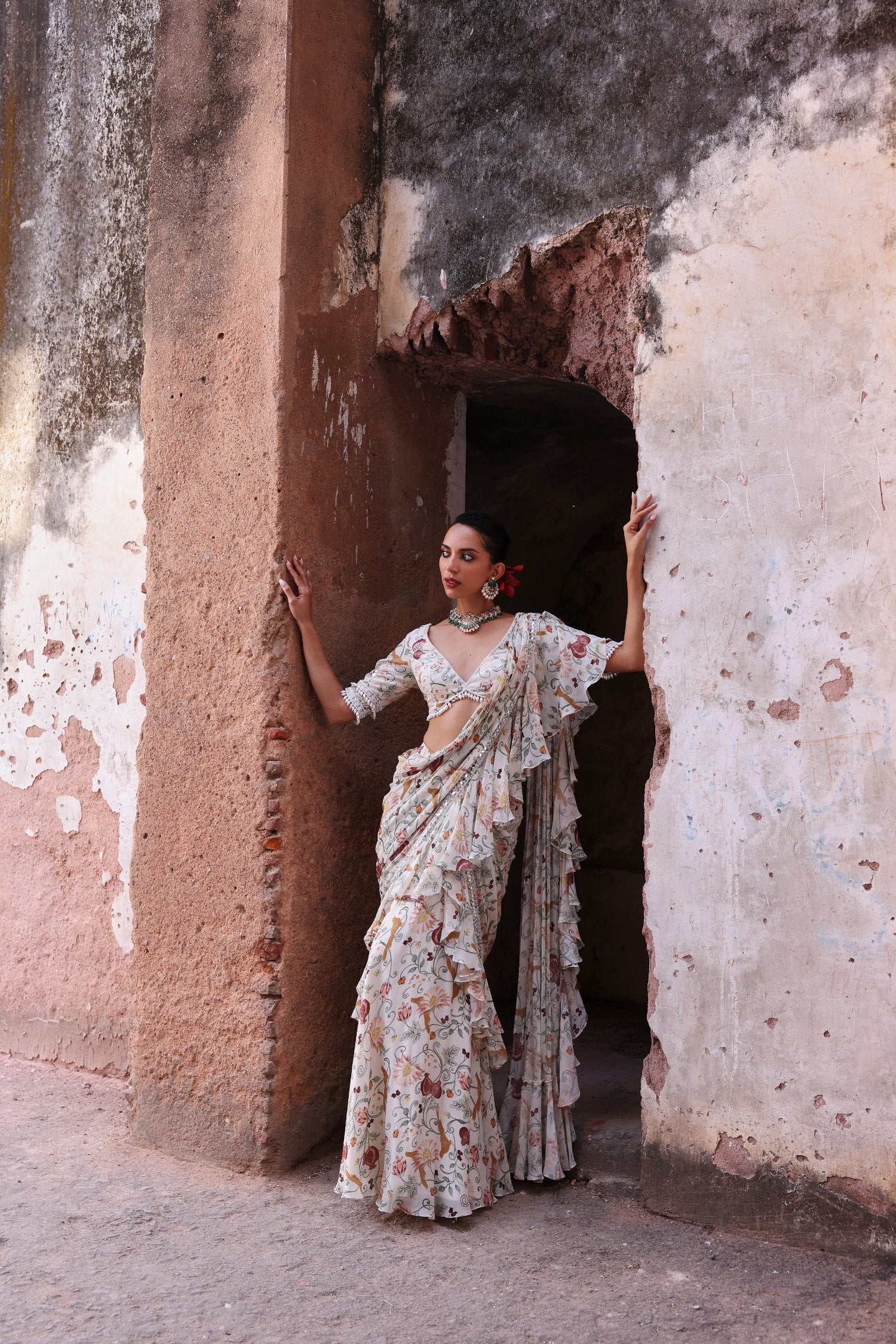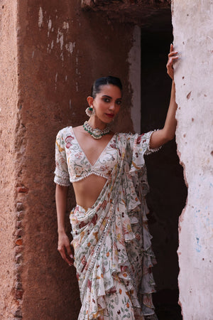 Printed Embellished Blouse Paired With Printed Ruffle Saree With Embellishment On Pallu