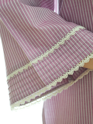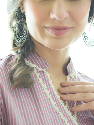 A burgundy oxford cotton kurta set with neck detailing and lace detailing at the sleeves. The tonal pant comes with bottom lace detailing.