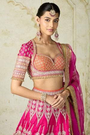 The heavily embroidered lehenga highlighted with a broad embellished hemline for a grand finish. The matching blouse is styled with a sweetheart neckline and ornate embroidery, perfectly complementing the voluminous skirt. A sheer dupatta with delicate motifs and a richly bordered edge completes the ensemble.