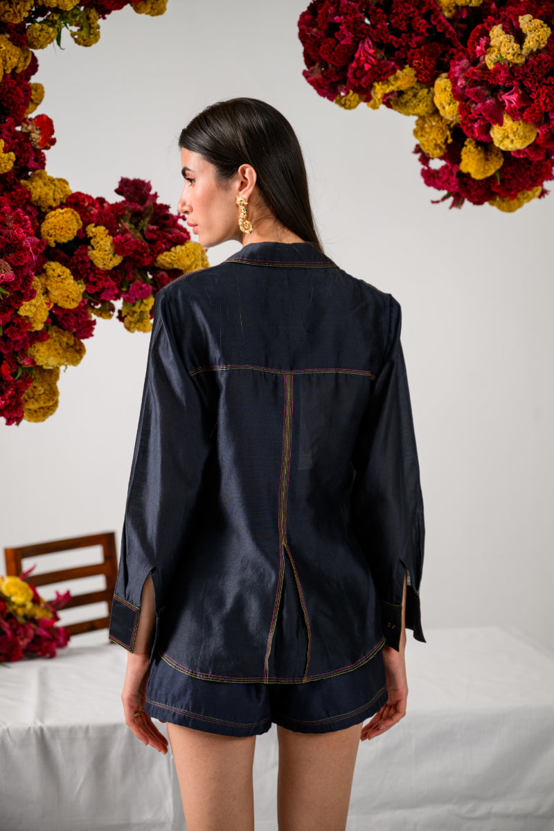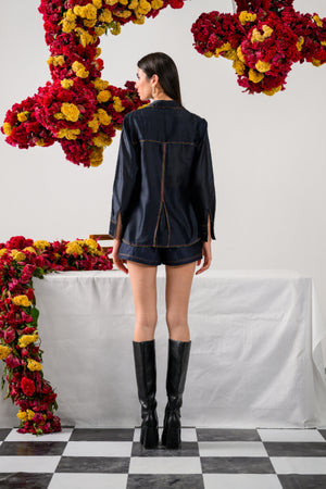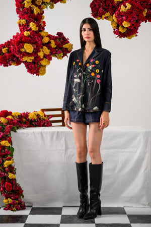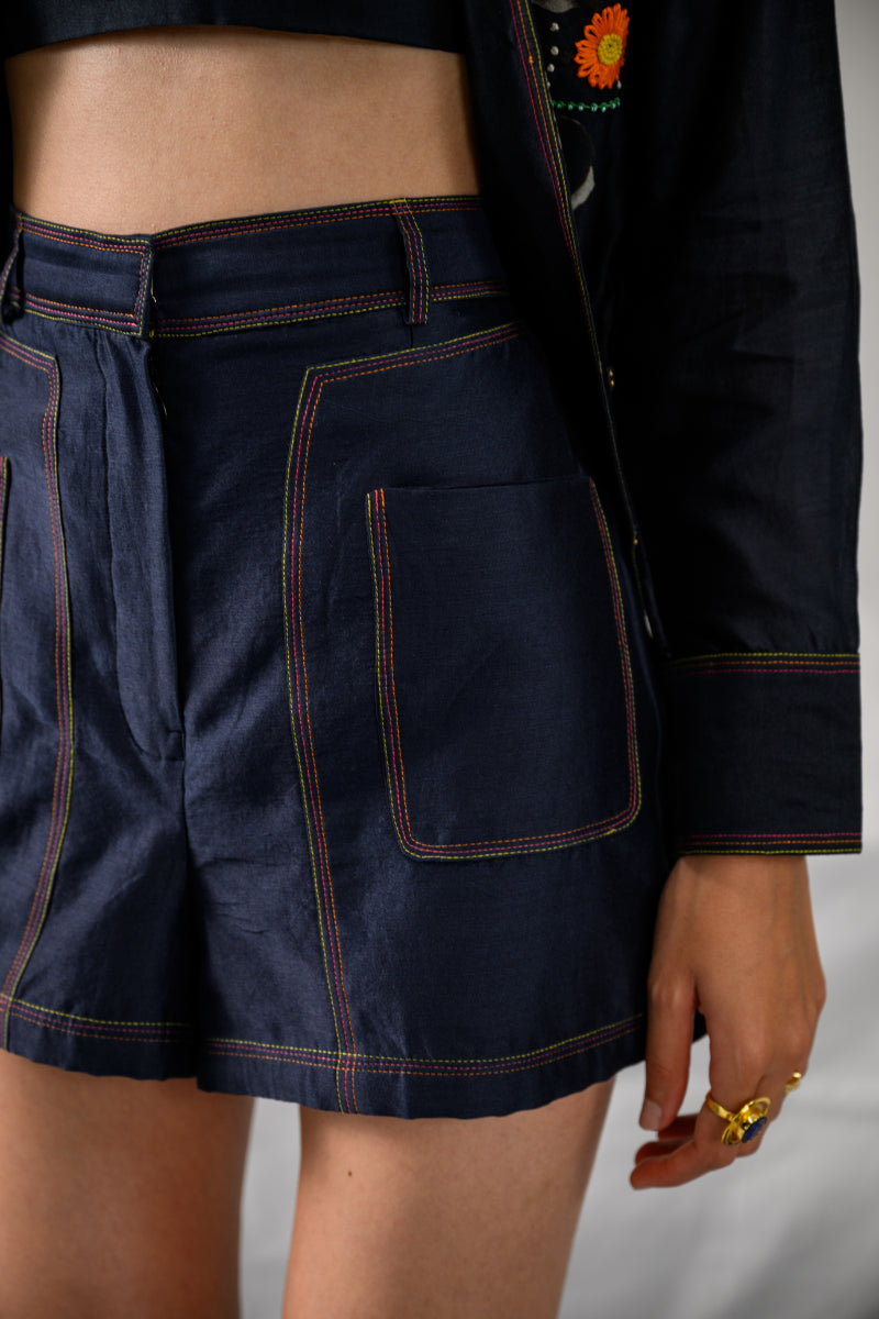 Embrace timeless elegance with the Heirloom Petals Shirt, where black vintage floral prints meet a vibrant spectrum of colorful anchor thread and beadwork. The florals pop with green sequin stems, while playful self-stitch detailing and a unique box pleat at the back make a fashion statement. Paired effortlessly with casual shorts featuring bold front patch pockets, these shorts shine with multicolor self-stitch accents decorating the belt, pockets, and seams. Together, they create a strikingly fresh, yet relaxed look that’s perfect for any stylish occasion.