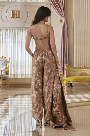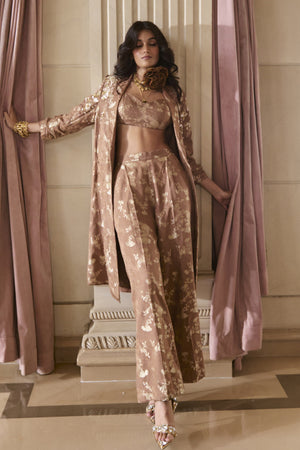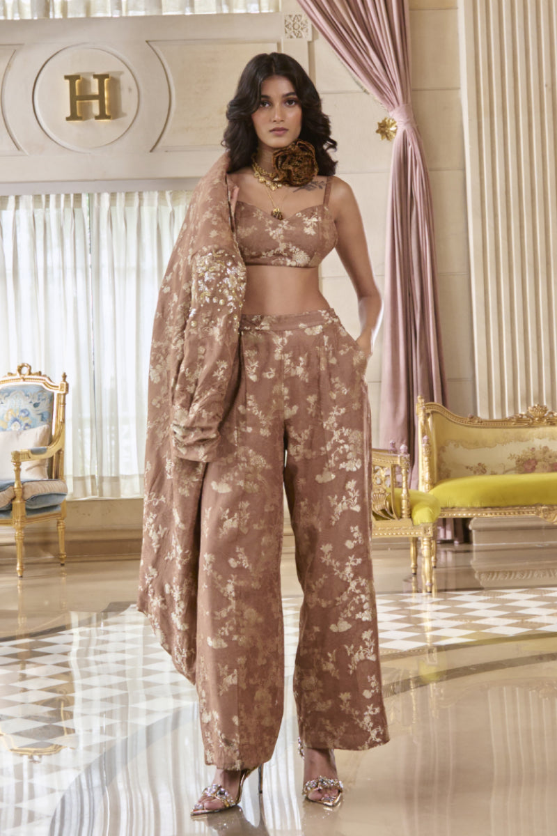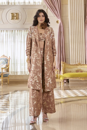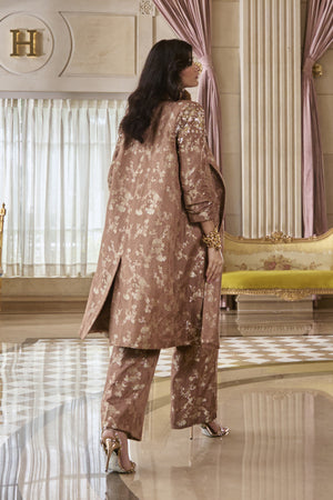 A fresh addition to our festive lineup elevate your festive style with this elegant jacquard co-ord set, featuring tailored pants, a refined blouse, and a statement jacket adorned with intricate hand embroidery. This versatile ensemble blends traditional craftsmanship with modern structure.
