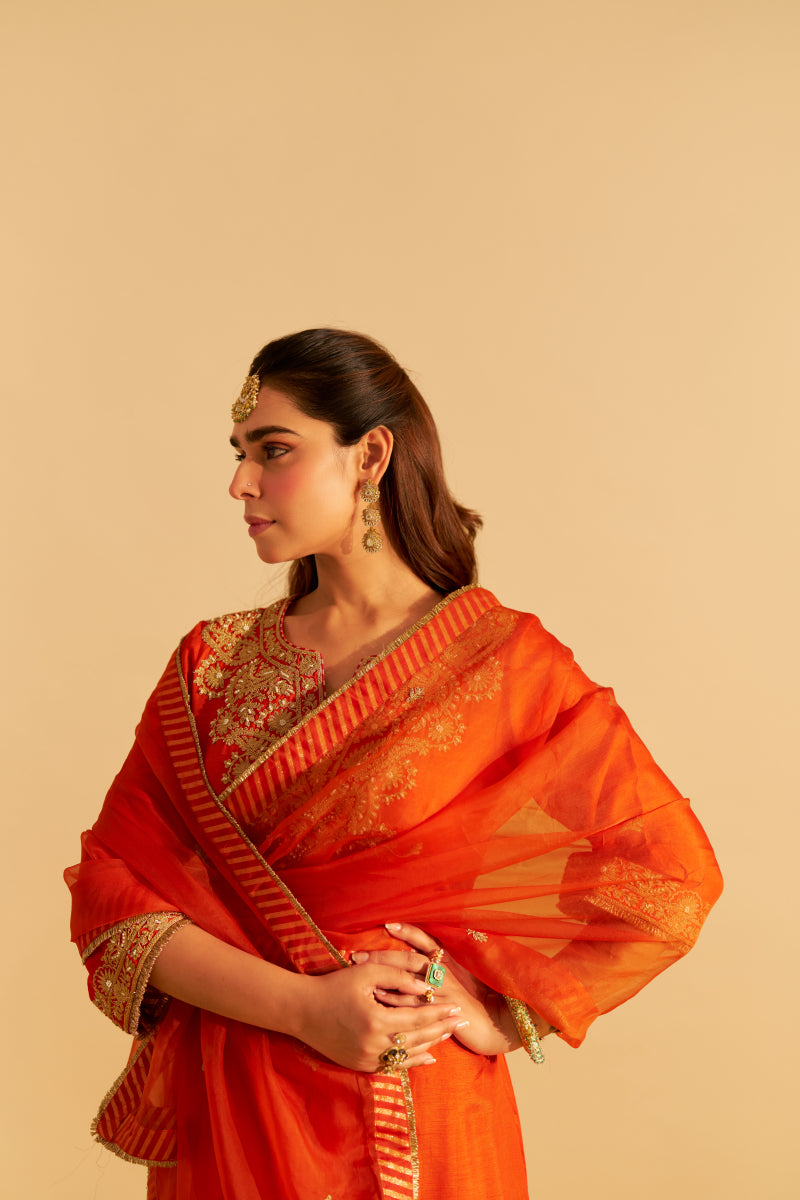 The entire outfit is beautifully finished with contrasting Banarasi fabric and gota accents, enhancing its festive and regal appeal.