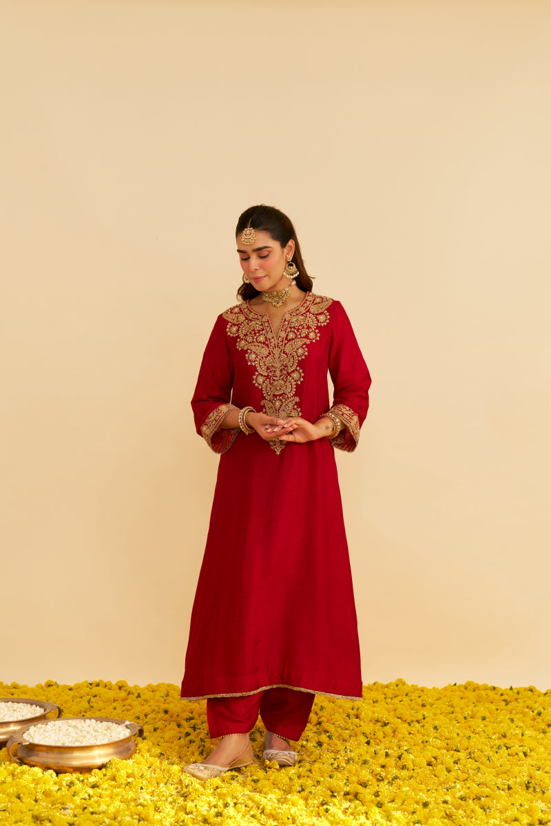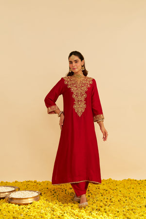 The long kaftan features a zero neckline with a front slit, a zero back, and three-quarter sleeves finished with traditional Kiran detailing. It is paired with a classic Dogri salwar, completing the ensemble with a touch of timeless charm.