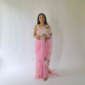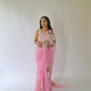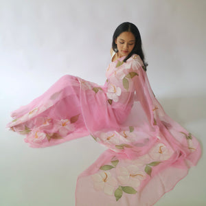 Pink Base Chiffon Saree Hand-Painted With White Hibiscus Flowers