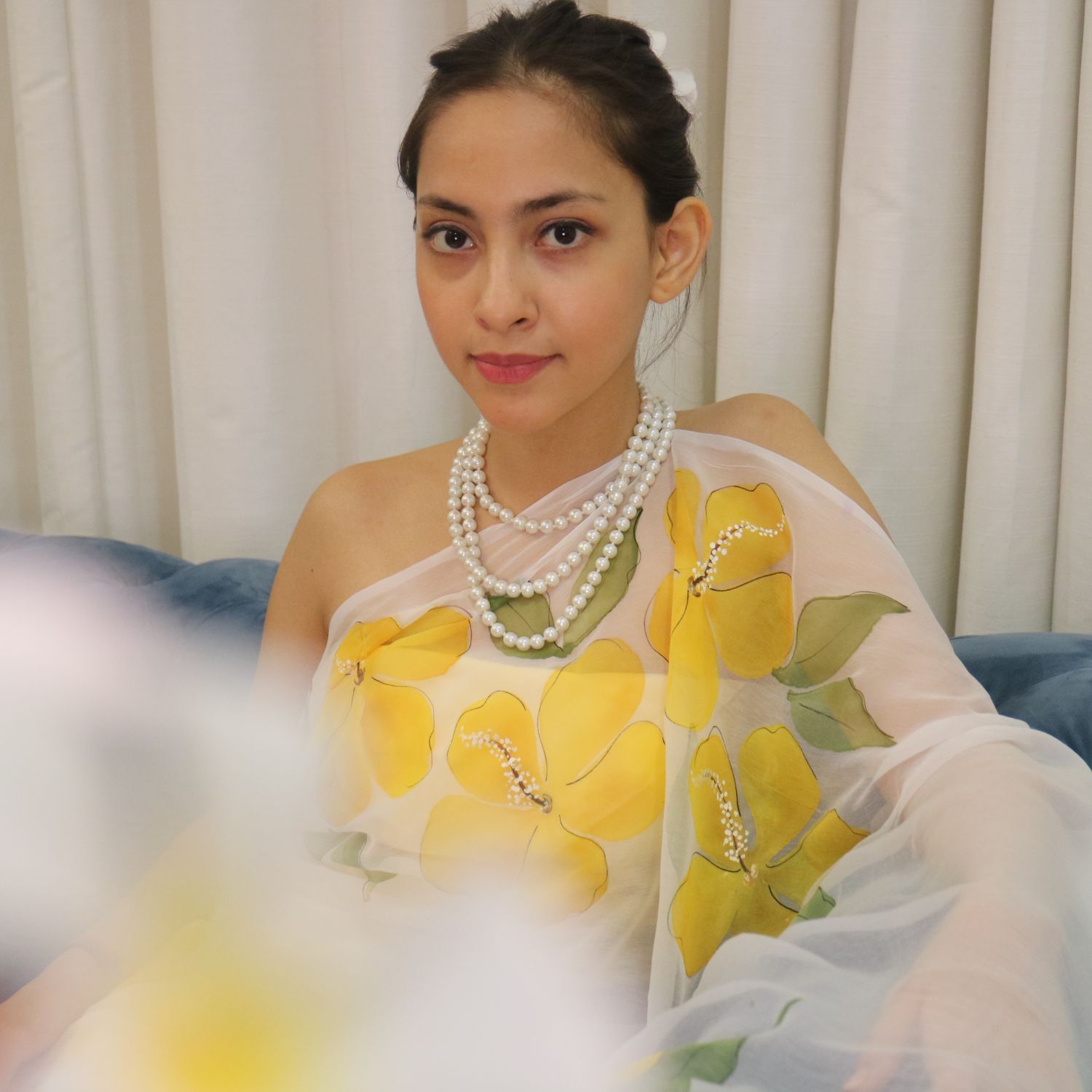 White Base Chiffon Saree Hand-Painted With Yellow Hibiscus Flowers