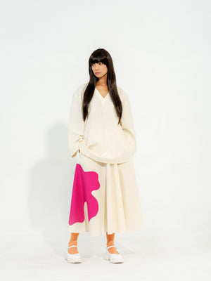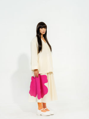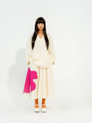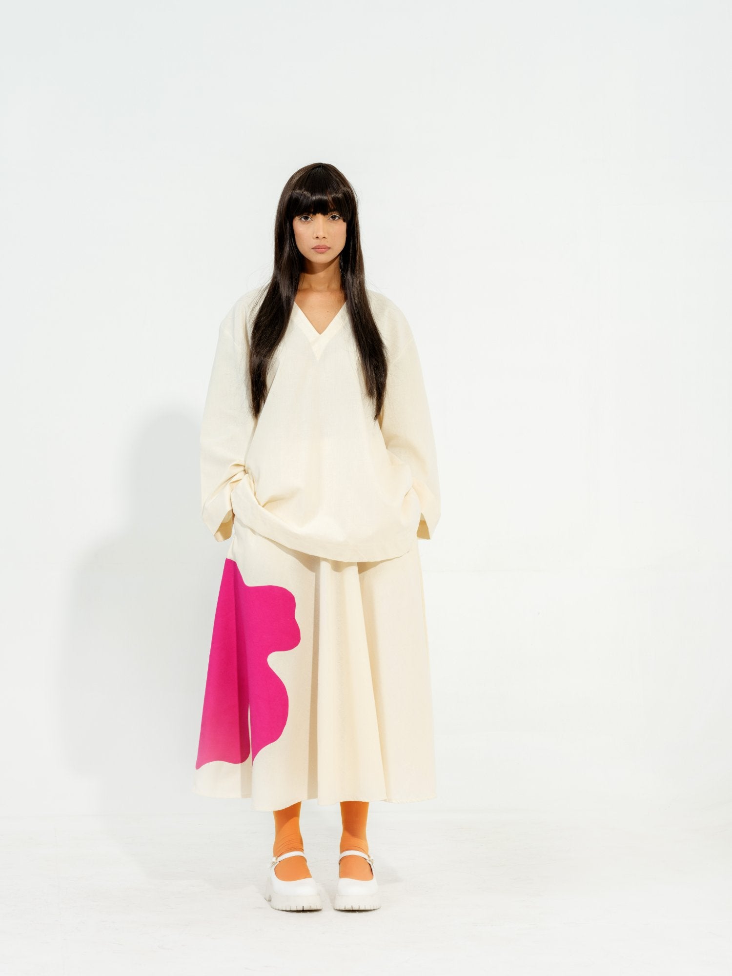 V-neck mid length tunic with flared sleeves and hand sewn finishes