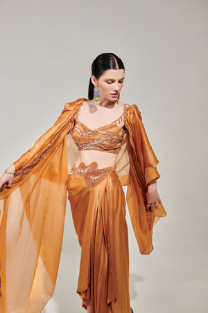 Honey Mustard Cowl Cape Set With Asymmetricdrape Skirt
