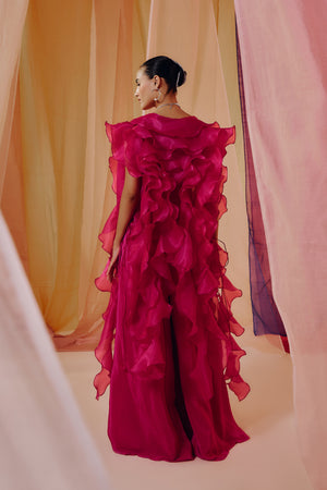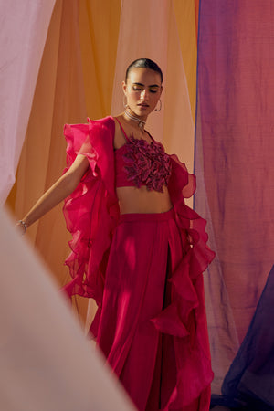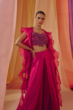 Hot Pink 3D Embroidered Blouse With Ruffle Cape And Drape Pants