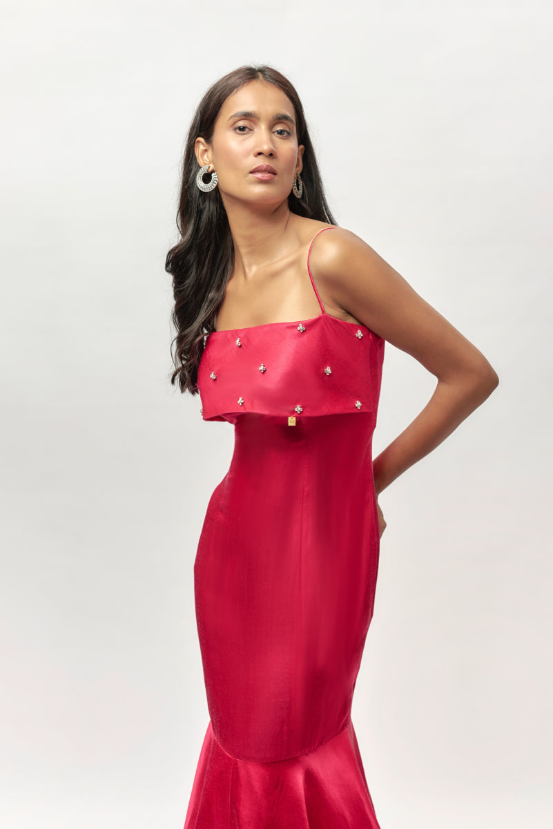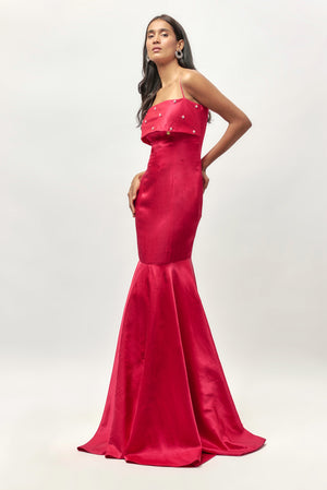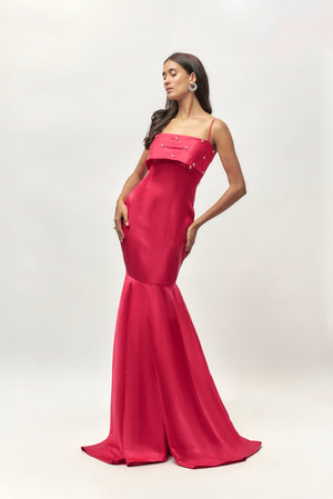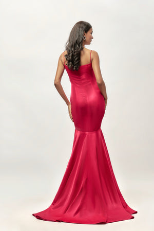 A captivating hot pink gown adorned with dazzling embellishments, combining vibrant charm with undeniable elegance. Its striking design and radiant hue make it perfect for stealing the spotlight at any event.