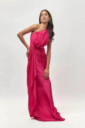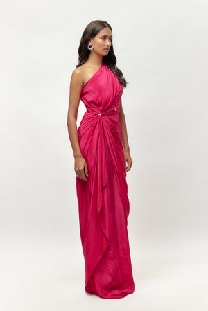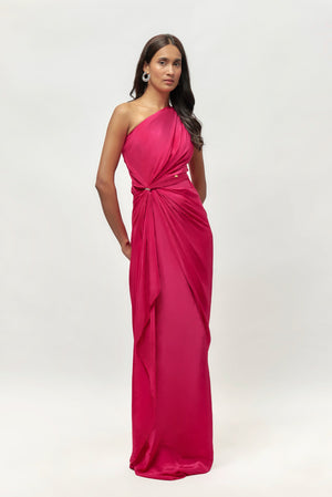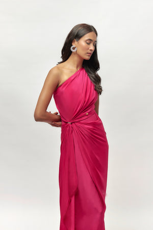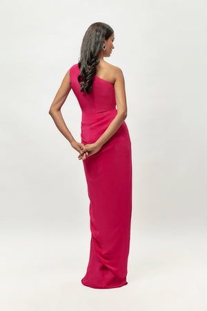A glamorous hot pink one-shoulder gown adorned with exquisite embellishments, exuding bold sophistication. Its asymmetric design and vibrant hue make it a head-turning choice for any special occasion.