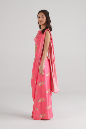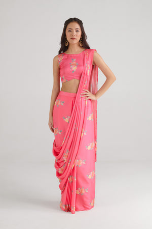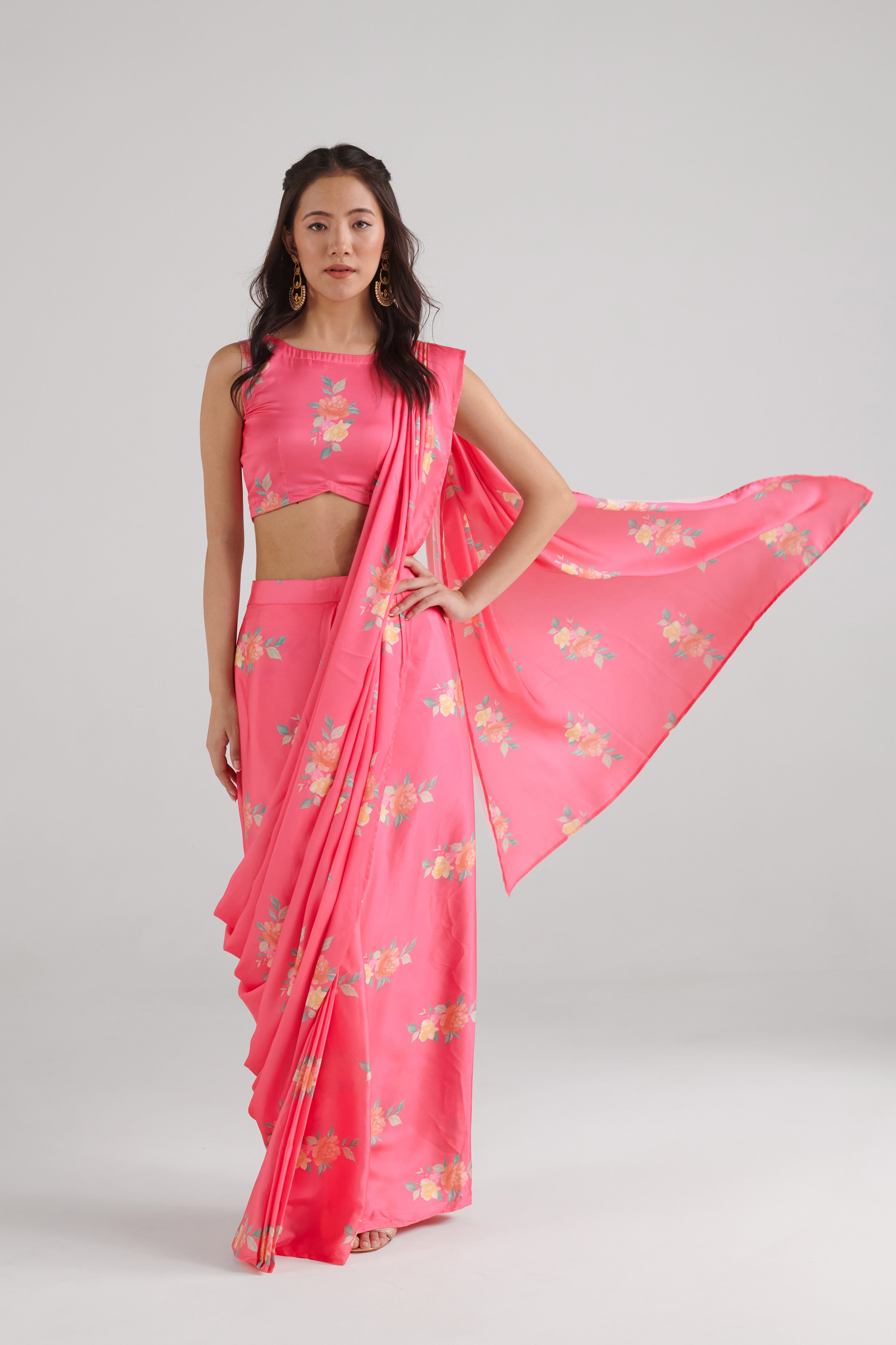 Elevate your style with our stunning hot pink blouse, featuring a chic V-cut front. Paired with a pre-draped floral saree skirt, this vibrant and elegant outfit is perfect for any occasion. Make a bold statement and embrace effortless fashion with this beautifully coordinated ensemble.