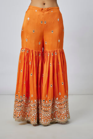 The outfit features a kurta adorned with mirror work and intricate silver detailing. The sharara is embellished with coordinated mirror accents and embroidery at the bottom. Dupatta with delicate scattered mirror embellishments completes the outfit.