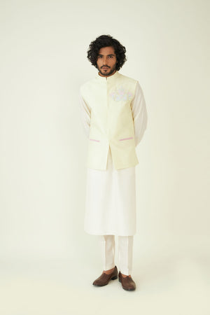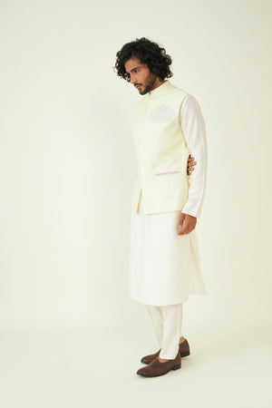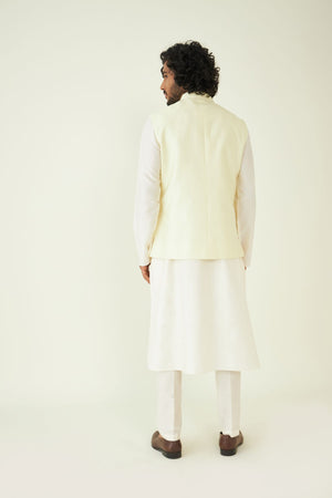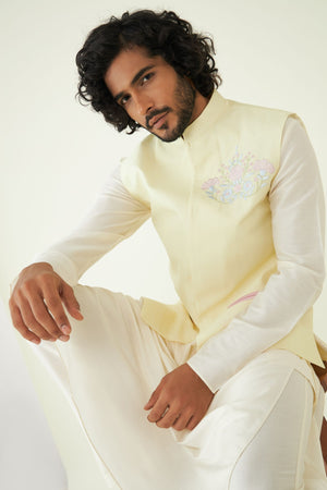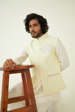 Pastel Yellow Embroidered Menswear Bundi. The Humdam Bundi is constructed in pastel yellow beautifully. The detailed embroidery adds a touch of luxury and cultural richness to your ensemble. The Bundi can be paired with an evergreen off-white kurta set.
