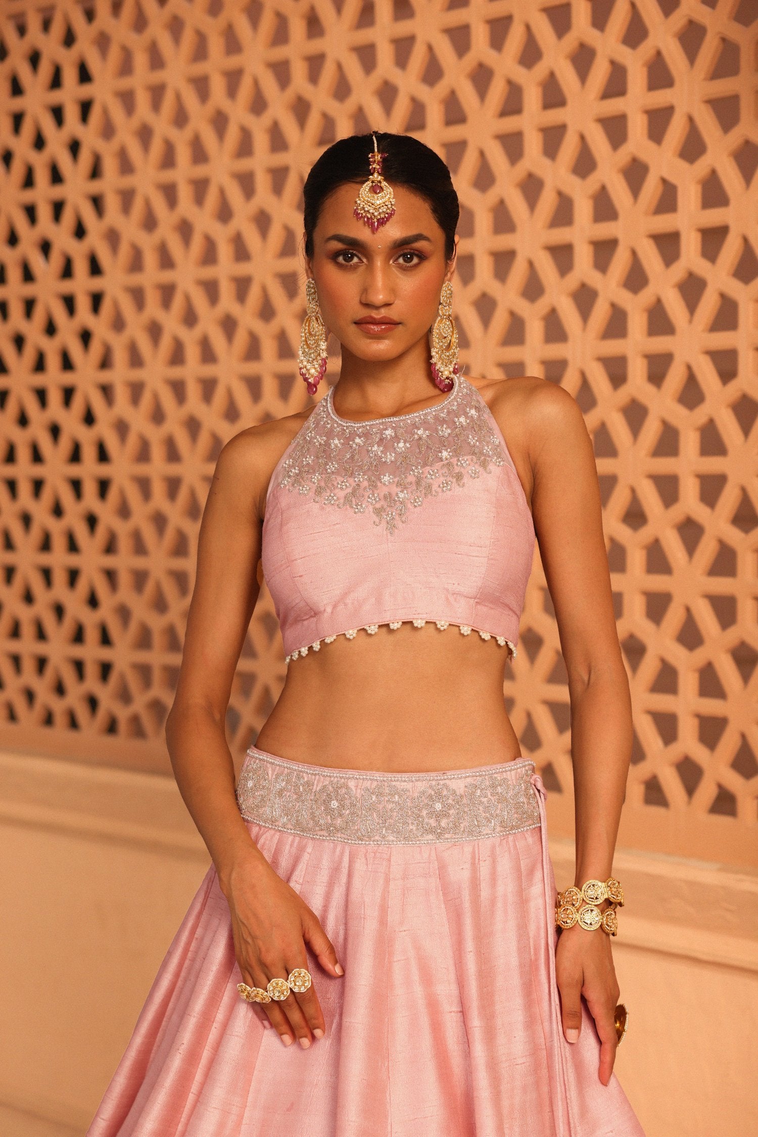 The Humeyra lehenga from our collection is crafted from pure silk, beautifully adorned with kirandori embroidery highlighted by dabka zardozi and pearls. The blouse features a zero-neck design with a stylish back knot. The dupatta is made of French net, showcasing an embroidered border and charming bootis at the center. To complete the look, the lehenga is elegantly finished with cascading pearls.