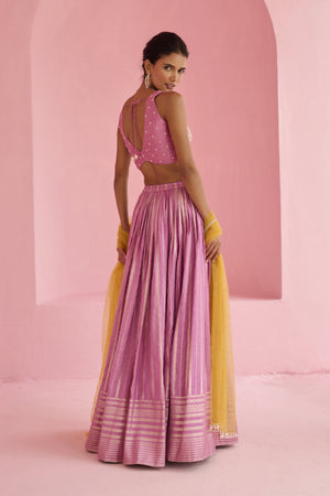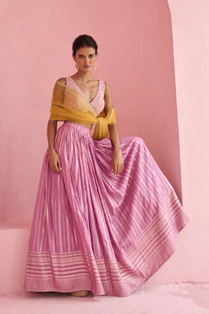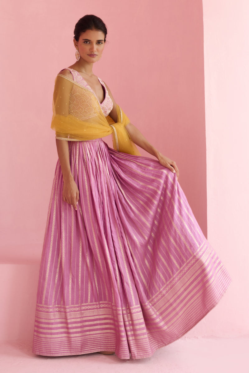 Jamewar Lehenga paired with pearl and glass beads embroidered blouse and contrast tulle dupatta.
