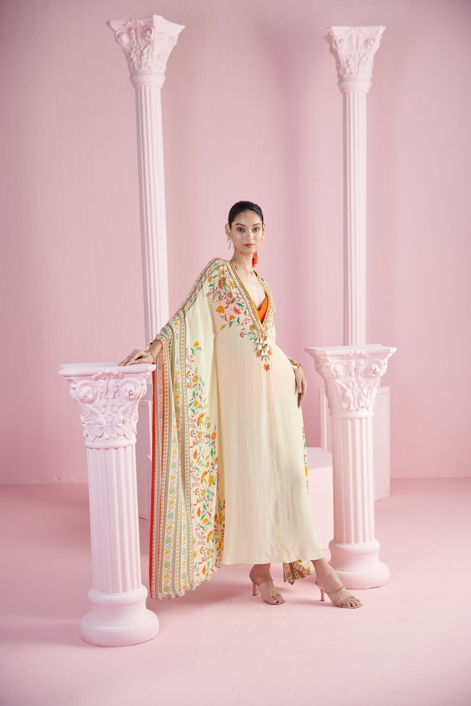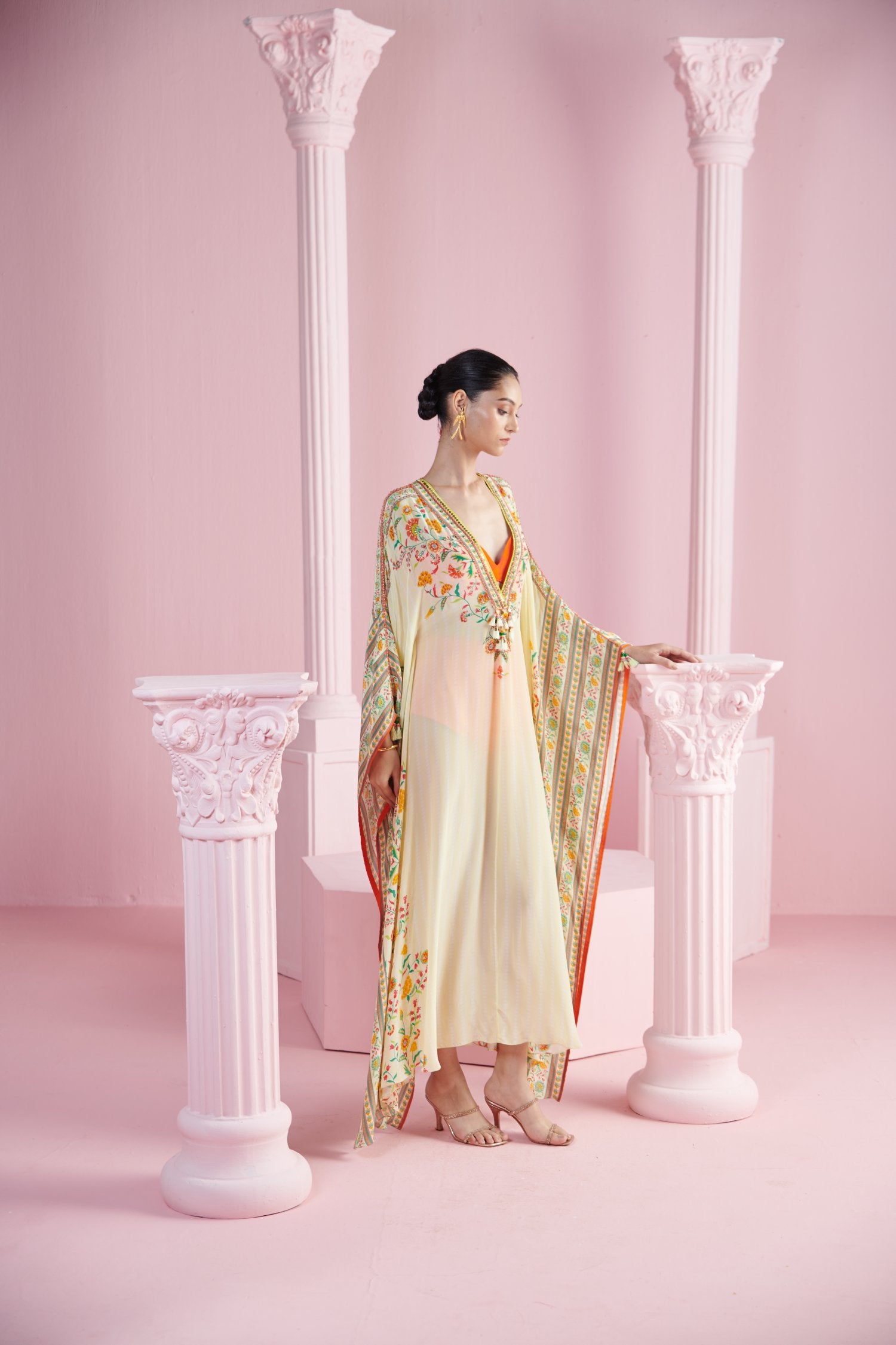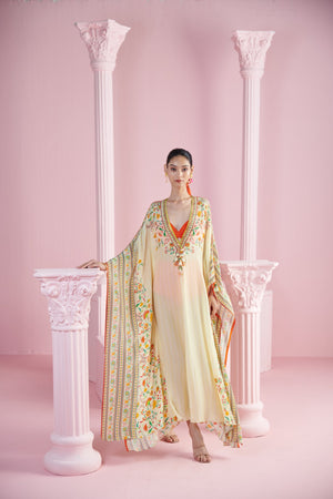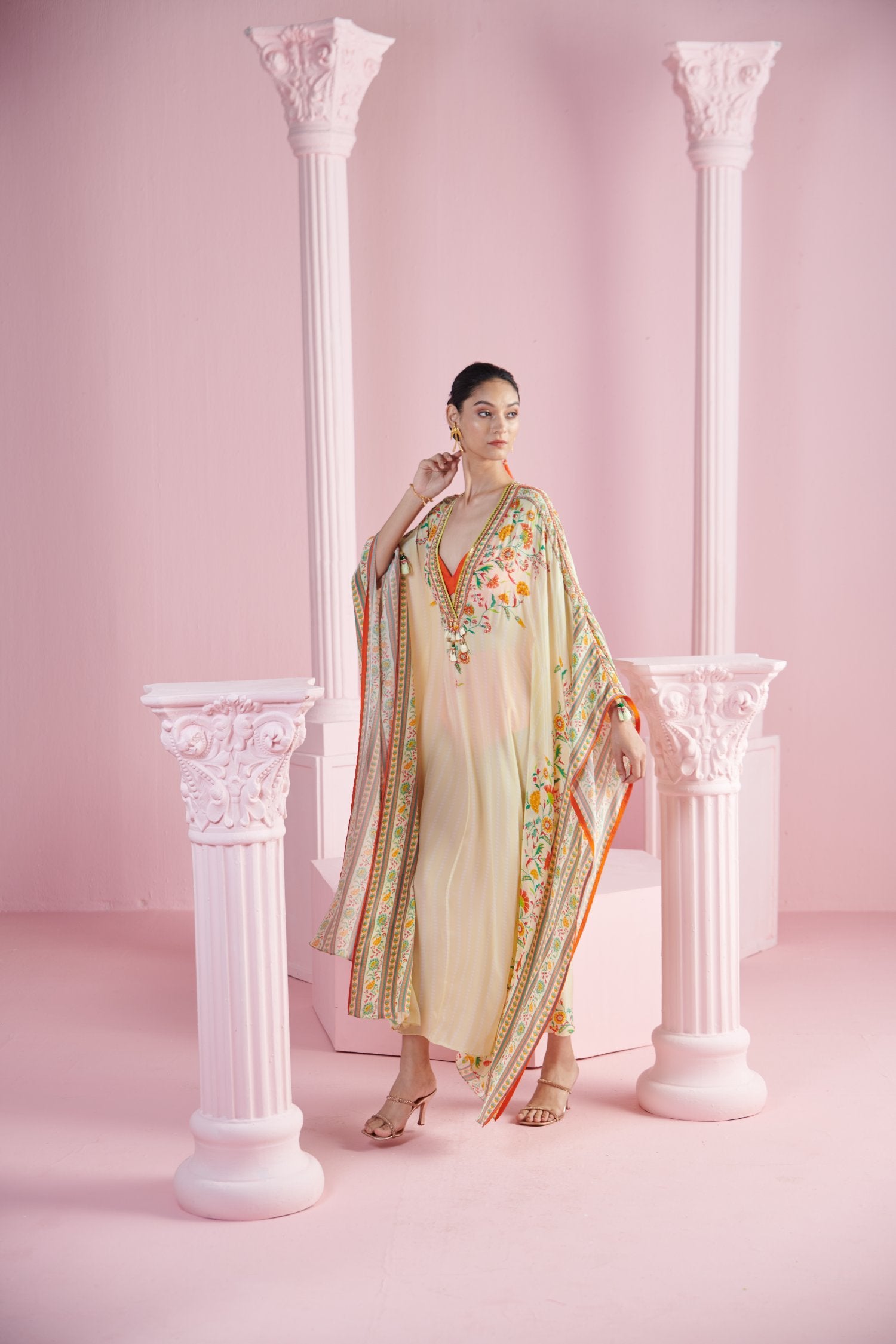 Infuse your wardrobe with a vibrant splash of color and pattern with this Lemon Iznik Printed Kaftan Set. The kaftan features a stunning Iznik-inspired print in a refreshing lemon hue along with deep v neck with embroidery detial, offering a perfect blend of tradition and modernity. Paired with an eye-catching orange bralette, this set introduces a bold contrast that adds a playful edge to the ensemble. Completing the look is a matching hipster, designed for comfort and style. Whether for a beach day or a chic lounge look, this set is all about effortless elegance with a touch of daring flair.