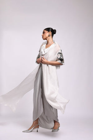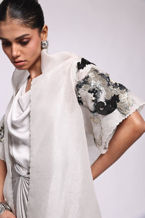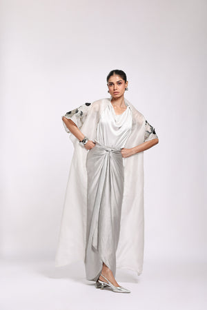 Organza Cape With Brocade Embellishment With Cowl Sarong Dress