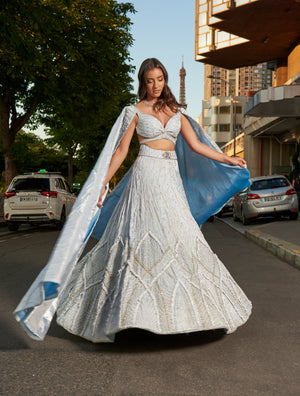 Ice Blue Lehenga Set, a masterpiece of contemporary elegance. Handcrafted with intricate hand embroidery, the organza lehenga and blouse exude sophistication. Complete with a unique trail organza dupatta